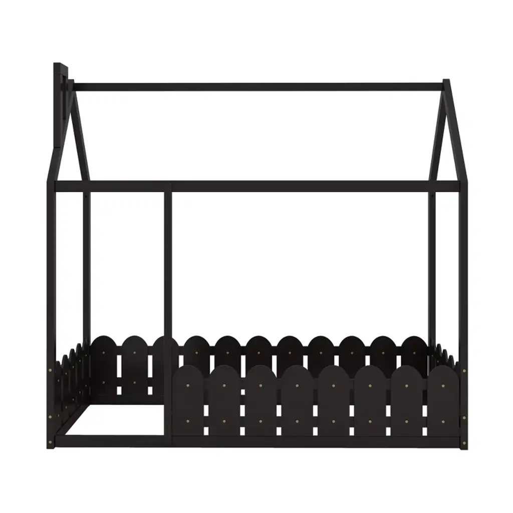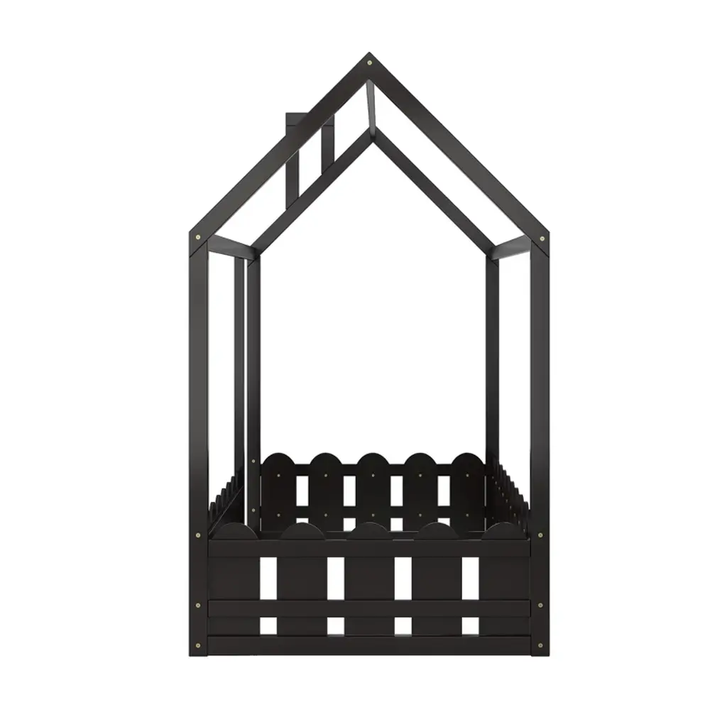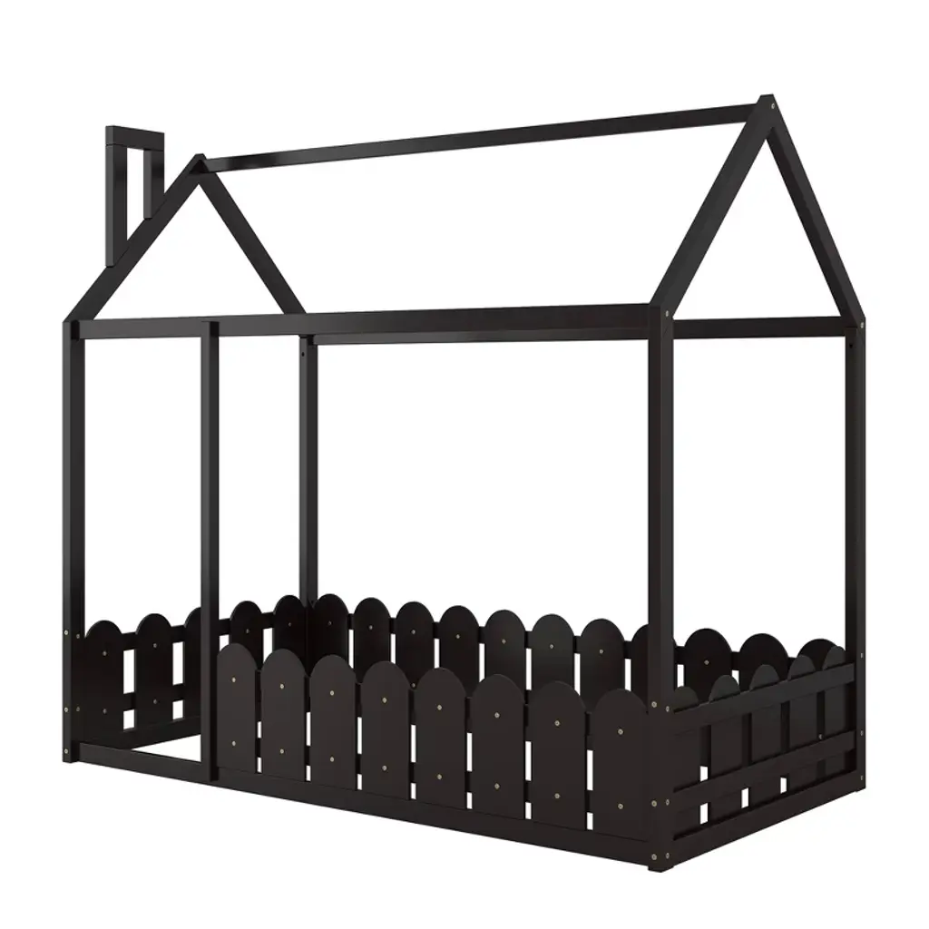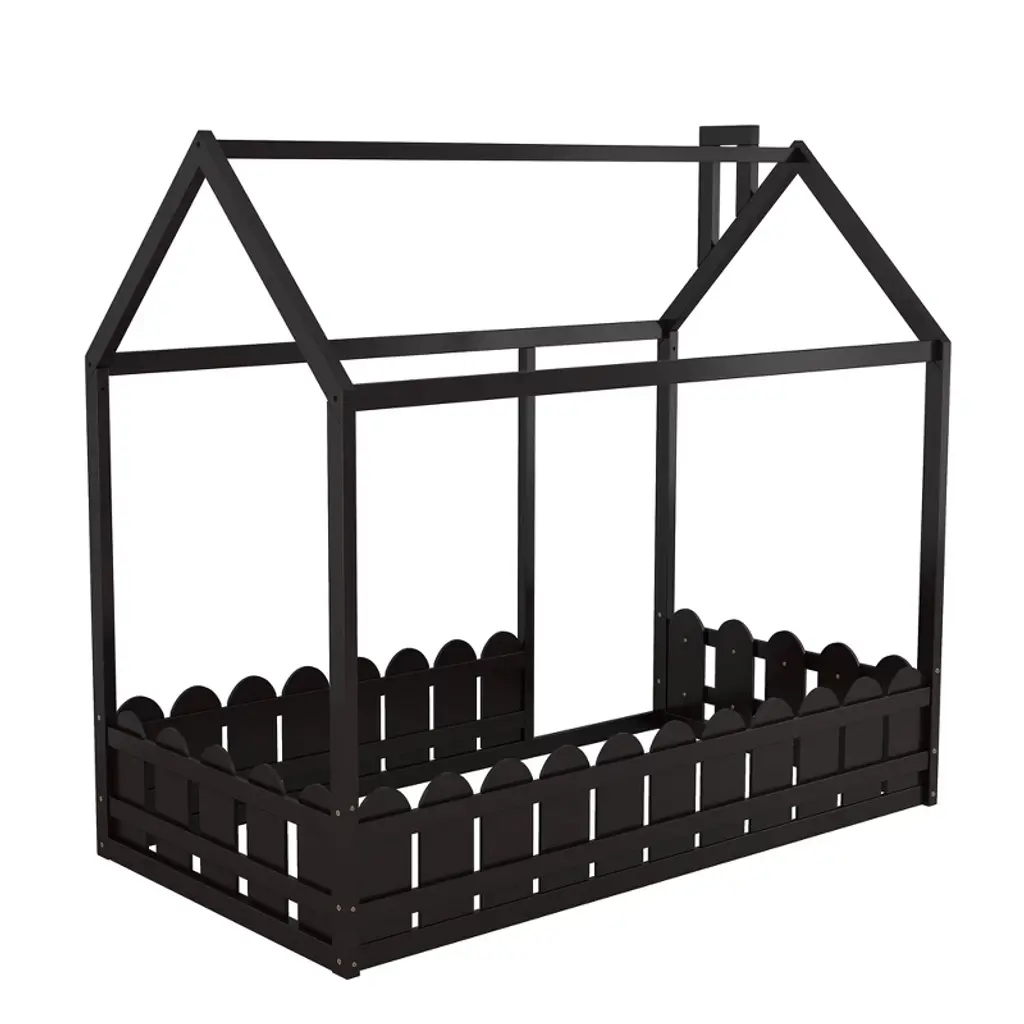 Product Features [Playhouse Design]: Featuring roof and fence, this unique bed creates a fun and adorable space that not only serves as a comfortable sleeping area but also doubles as a space for your kids to play and have fun.[A Better Sleeping Environment]: Thanks to the semi-enclosed space, your kids will have their own sleeping space that affords a comforting atmosphere for better sleep while not sacrificing air circulation.[Superior Quality]: The twin size house bed is constructed with a sturdy pinewood frame that can enhance stability and durability. Slats are not included — you need to prepare box springs or foundations.[Dimensions]: Overall bunk bed dimension: 78.7” x 41” x 70.5” (L x W x H). Weight capacity: no limit. This wood house bed will come in 1 package with clear instructions and hardware. Description Featuring roof and fence, this bed doubles as a semi-enclosed play place perfect for kids to study, watch TV or explore their imaginations. With fence and a sturdy pine frame, this bed offers a safe space for your kids to get a good nights sleep. Weight & Dimensions Overall Product Dimension: 78.7"L x 41"W x 70.5"HDetail Product Dimension: Please refer to the Size imageNumber of Package: 1Package Dimension: Please refer to the SpecificationOverall Product Weight: 77 LBSPackage Weight: Please refer to the SpecificationWeight Capacity: No limitRecommended Mattress Thickness: 6" - 8" Specifications Product Type: House BedSize: TwinMaterial: Plywood + MDF + PinewoodBox Spring Required: YesNumber of Slats: Slats are not includedAssembly Required: Yes