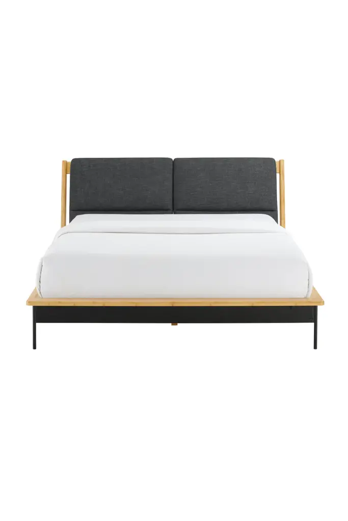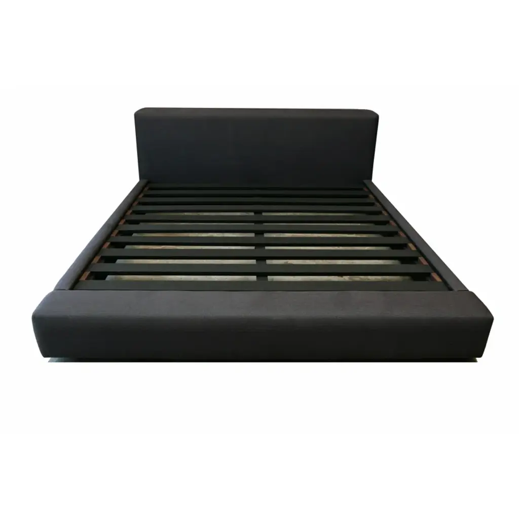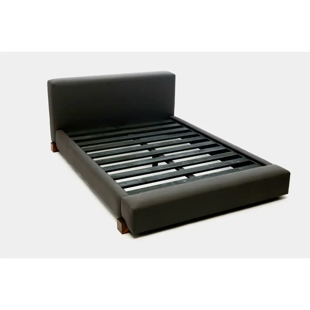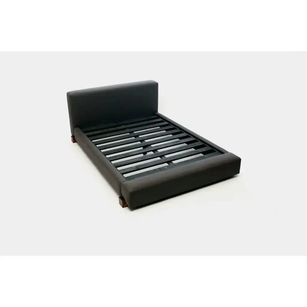 Artless Up bed has a 9" by 9" profile that loops around the mattress, defining the headboard, footboard, and sideboards. Its 4" by 4" square Walnut feet complement, and slightly raised, the bed off of the ground. The bed is fully padded while perfectly modern, a little oasis of respite.