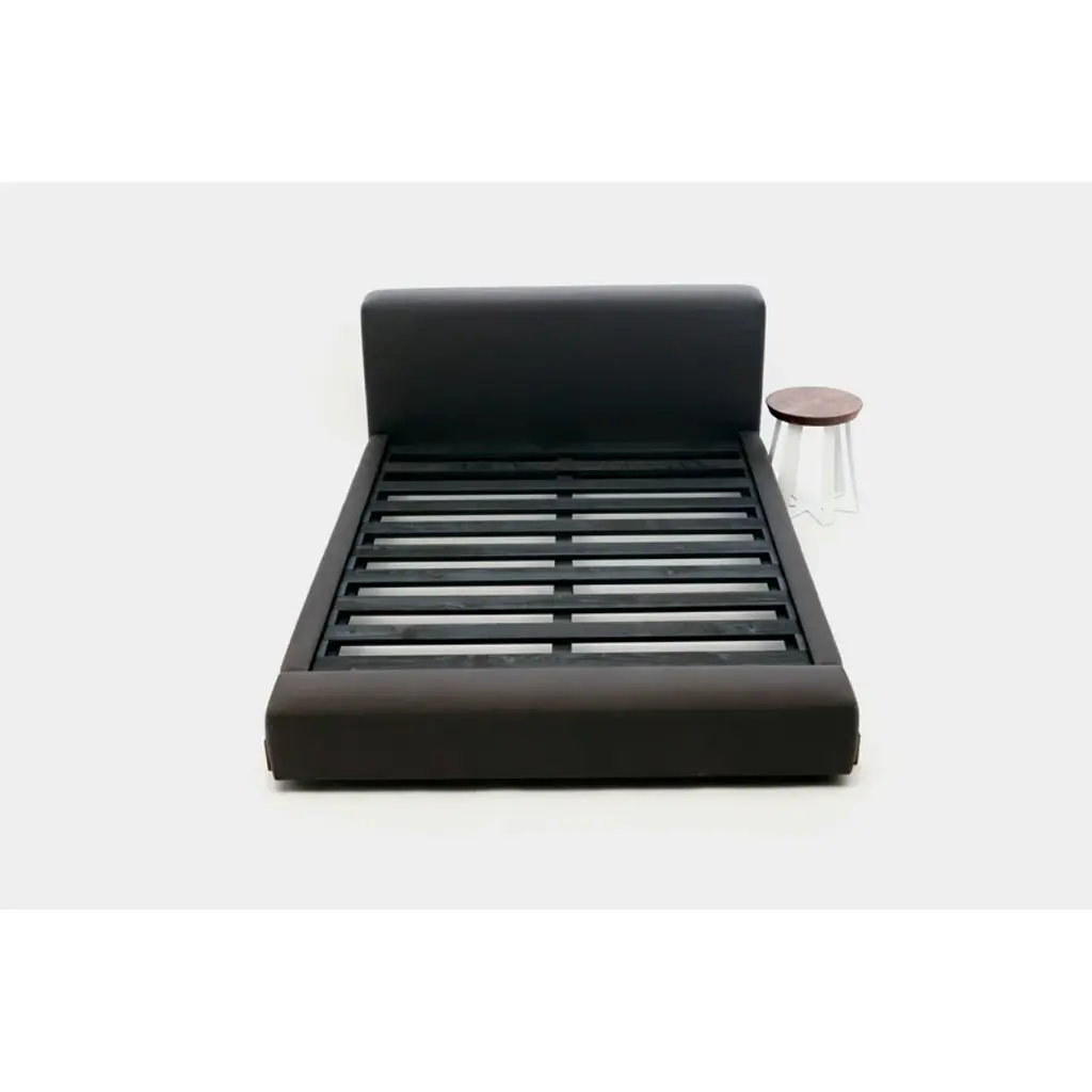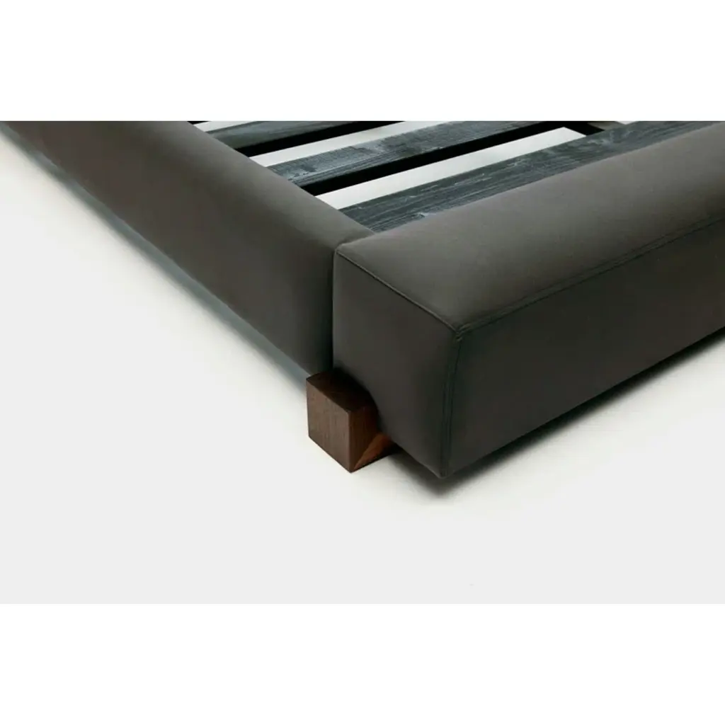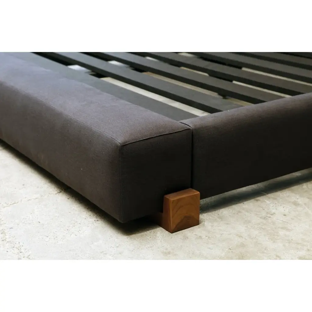 Artless Up bed has a 9" by 9" profile that loops around the mattress, defining the headboard, footboard, and sideboards. Its 4" by 4" square Walnut feet complement, and slightly raised, the bed off of the ground. The bed is fully padded while perfectly modern, a little oasis of respite.