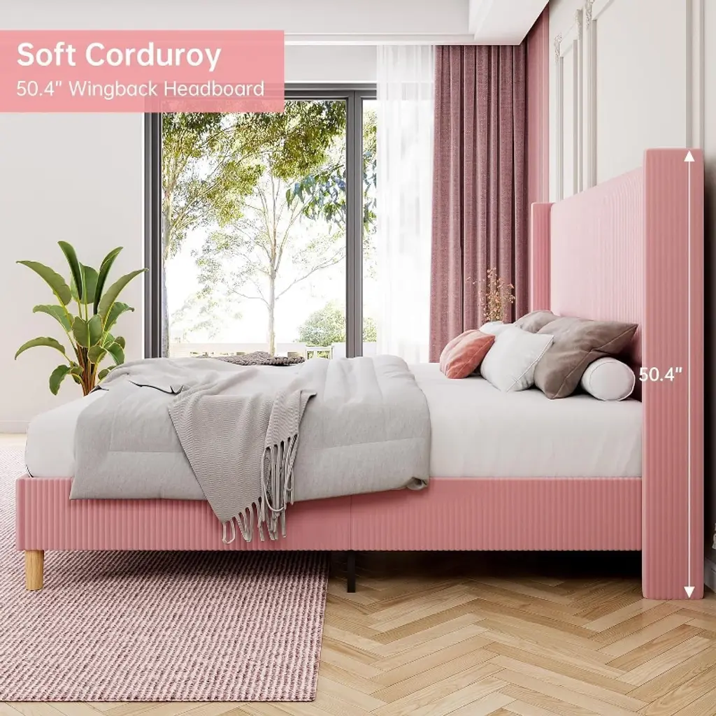 Introducing our beautifully upholstered bed frame, designed to elevate your bedroom with its stylish headboard featuring elegant wing sides. The soft pink fabric adds a vibrant touch, making it a standout piece that enhances both aesthetics and coziness, perfect for personal retreats or guest accommodations. With an innovative noise-free design, this bed frame minimizes movement and eliminates creaks, ensuring you and your loved ones enjoy uninterrupted sleep—ideal for light sleepers and couples seeking a serene environment. Constructed with sturdy wooden slat support, the frame offers exceptional stability and durability, effectively distributing weight to prevent sagging and extend mattress life. You can rest easy knowing this bed frame is built for long-lasting comfort. Designed for user convenience, it features an easy assembly process with step-by-step instructions, allowing you to set it up quickly with all necessary tools included. The versatile pink upholstery seamlessly blends with various decor styles, whether modern, vintage, or transitional, making it easy to create a cohesive bedroom aesthetic. Experience comfort, style, and practicality with our exquisite bed frame!
