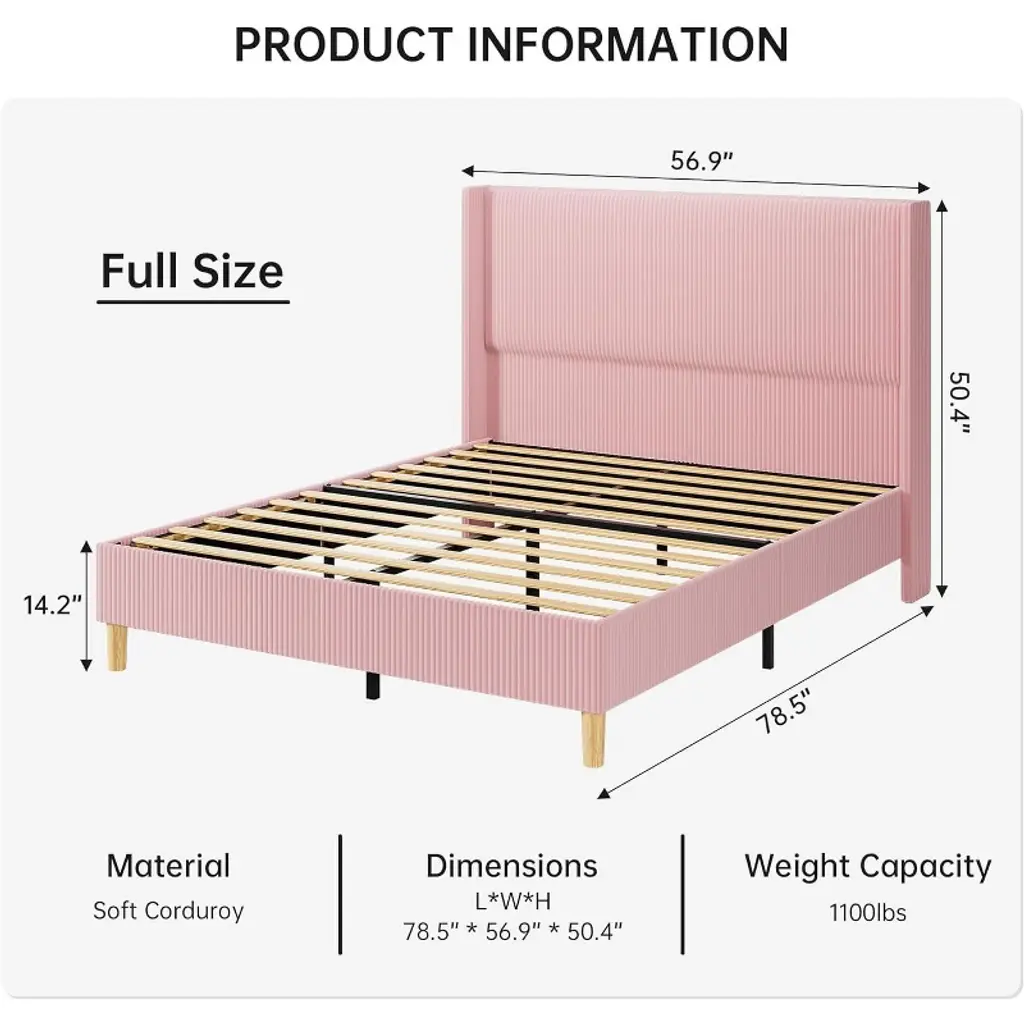 Upholstered Full Bed Frame With Headboard And Wing Sides, Noise-free Design, Wooden Slat Support, Easy Assembly, Pink