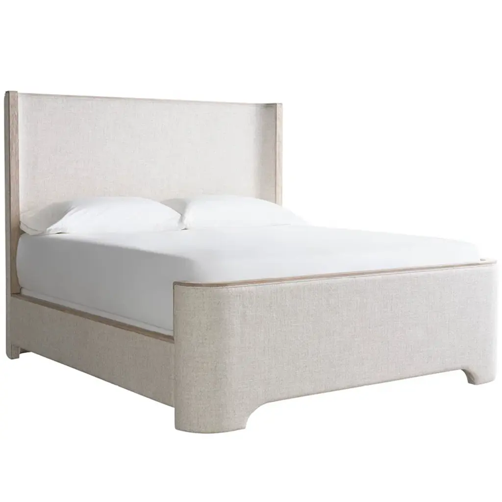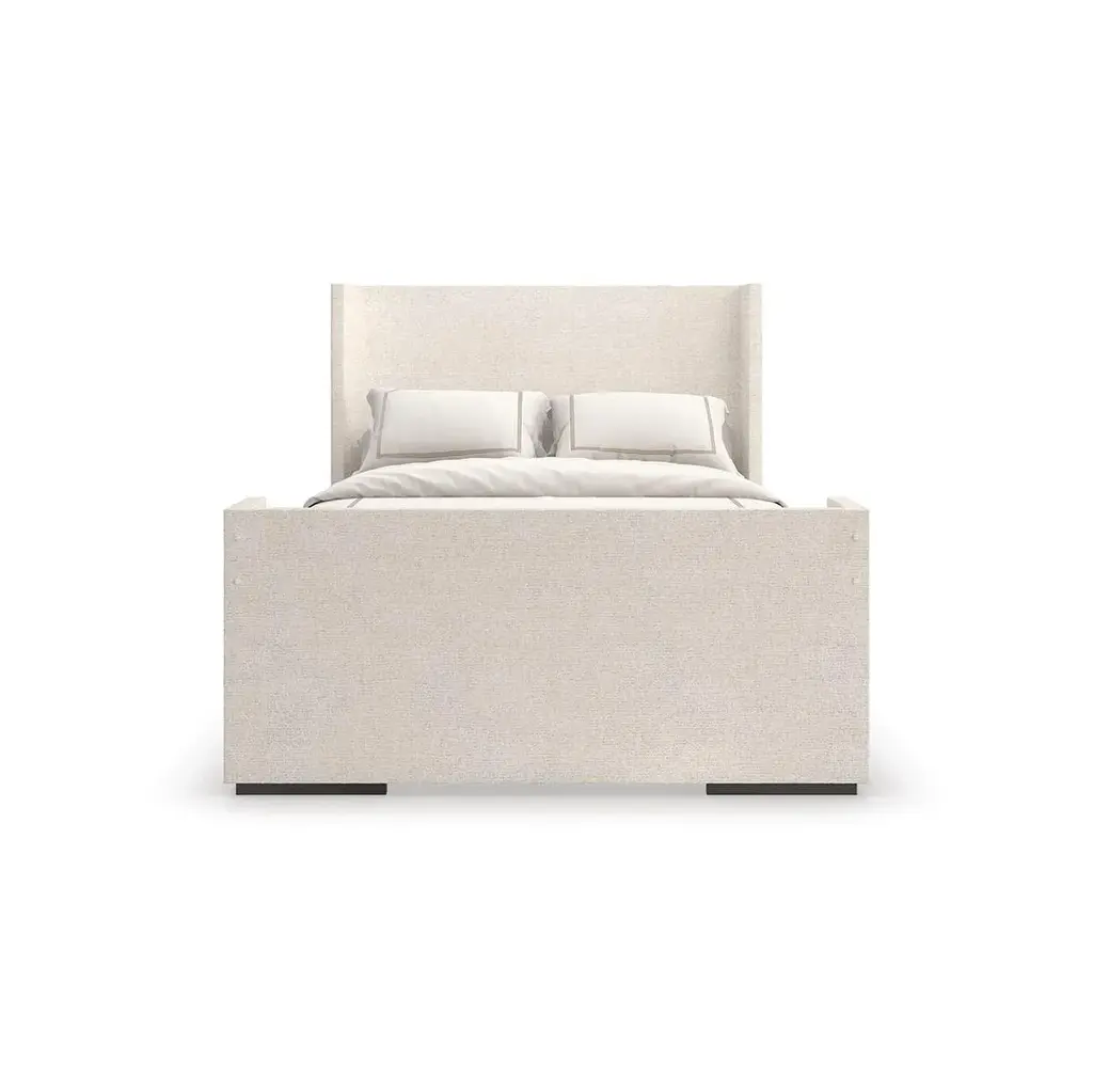 Dressed in a soft chenille fabric, this king bed brings an air of effortless elegance and enveloping comfort. Its simple, geometric form and soothing neutral hue blend beautifully with classic or modern design aesthetics. Raised on contrasting feet and features upholstered decorative buttons that cover brackets for fitting an optional, clean-lined canopy that adds a note of drama in an Almost Black finish. Dimensions: 66" W x 86" D x 58" H Canopy is sold separately 2965-88CC-P Performance