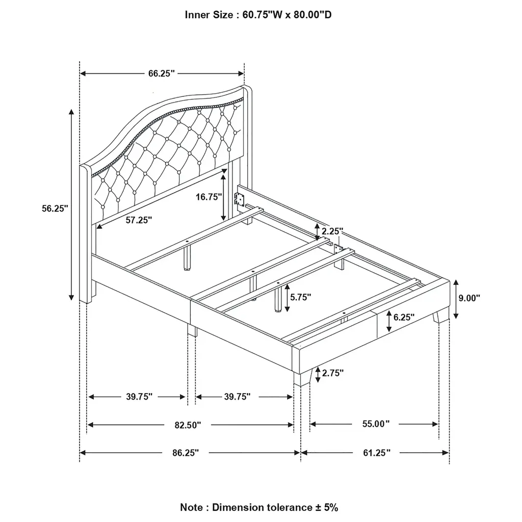 This bed frame features a warm, neutral tone that adds a soft and elegant touch, perfectly complementing both modern and classic interiors. Softly padded and wrapped in premium fabric or leather, its classic high-back design with side panels offers added support and a sophisticated look, while requiring a box spring for enhanced mattress support and longevity. Product Details Set includes One (1) Bed Dimensions 56.25 inches high x 66.25 inches wide x 86.25 inches long Materials Fabric,Foam,Laminated Veneer Lumber