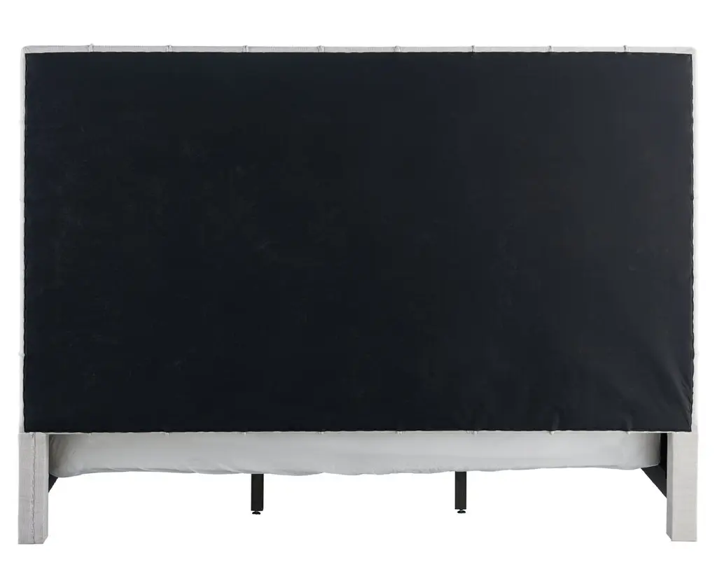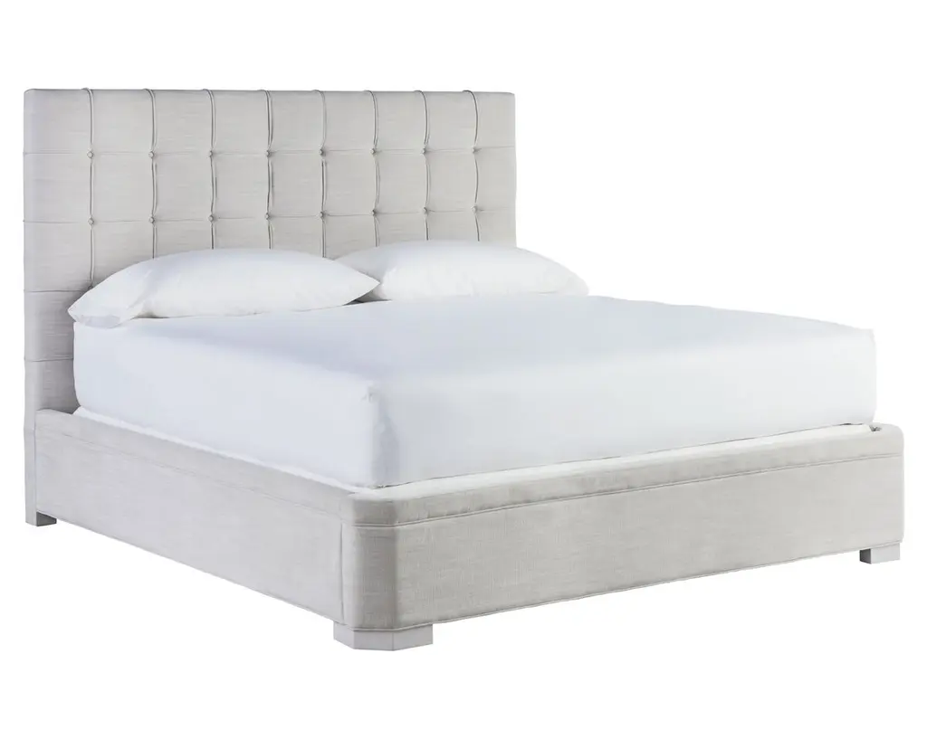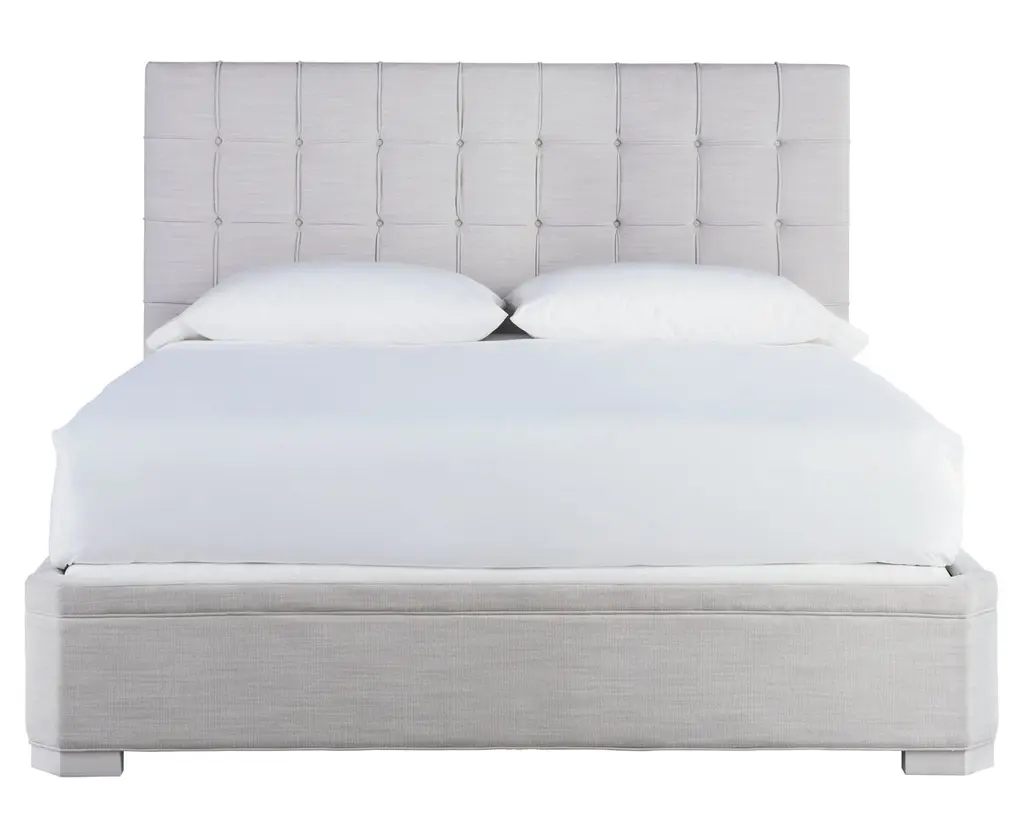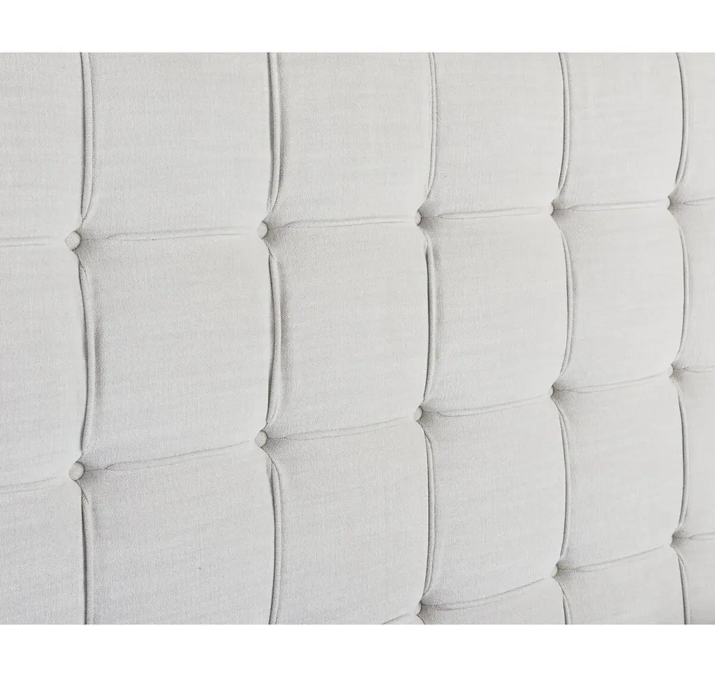 Off-white upholstery covers both the base and the headboard of this timelessly elegant bed. Button tufting makes the headboard especially inviting to lean against while you read or watch TV.