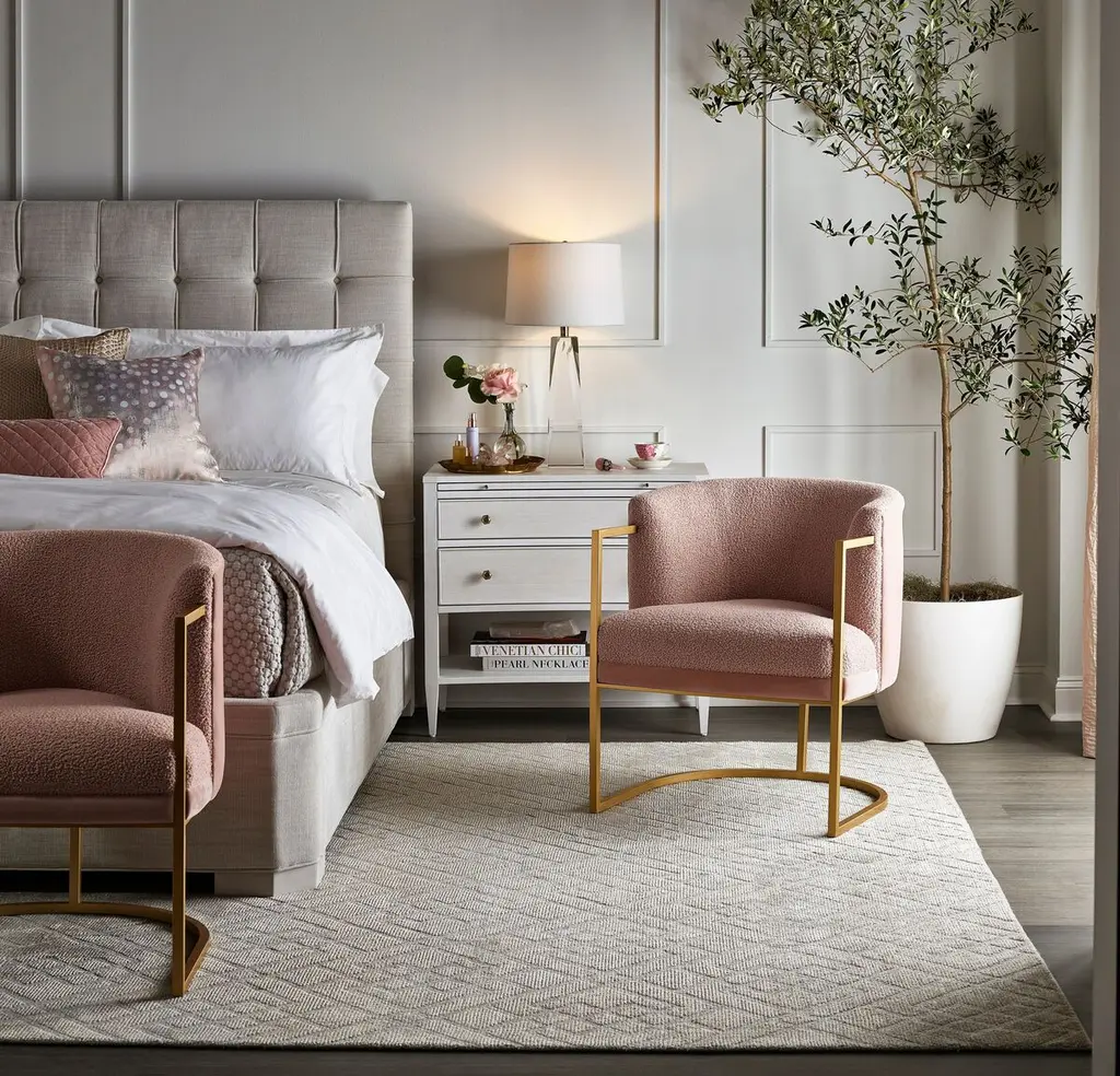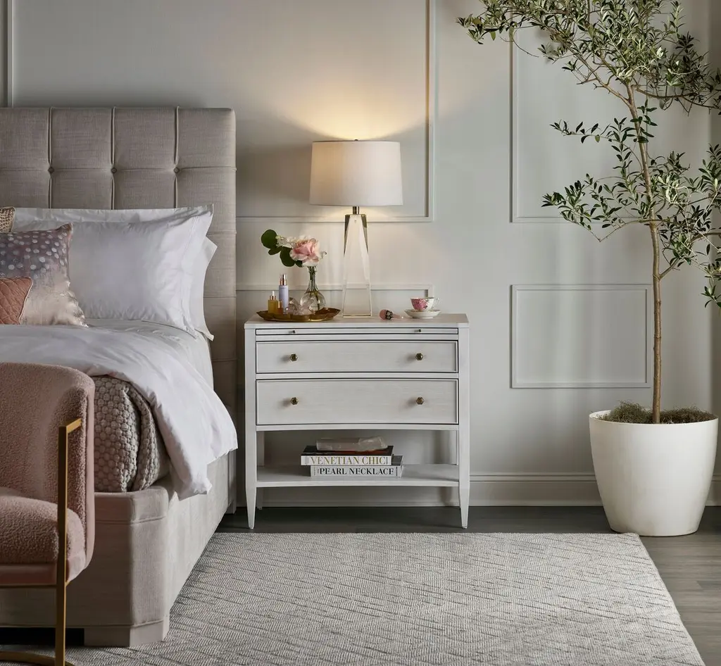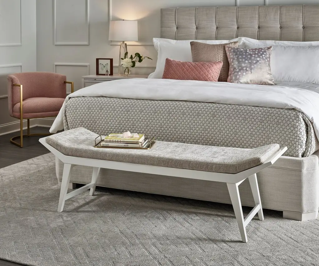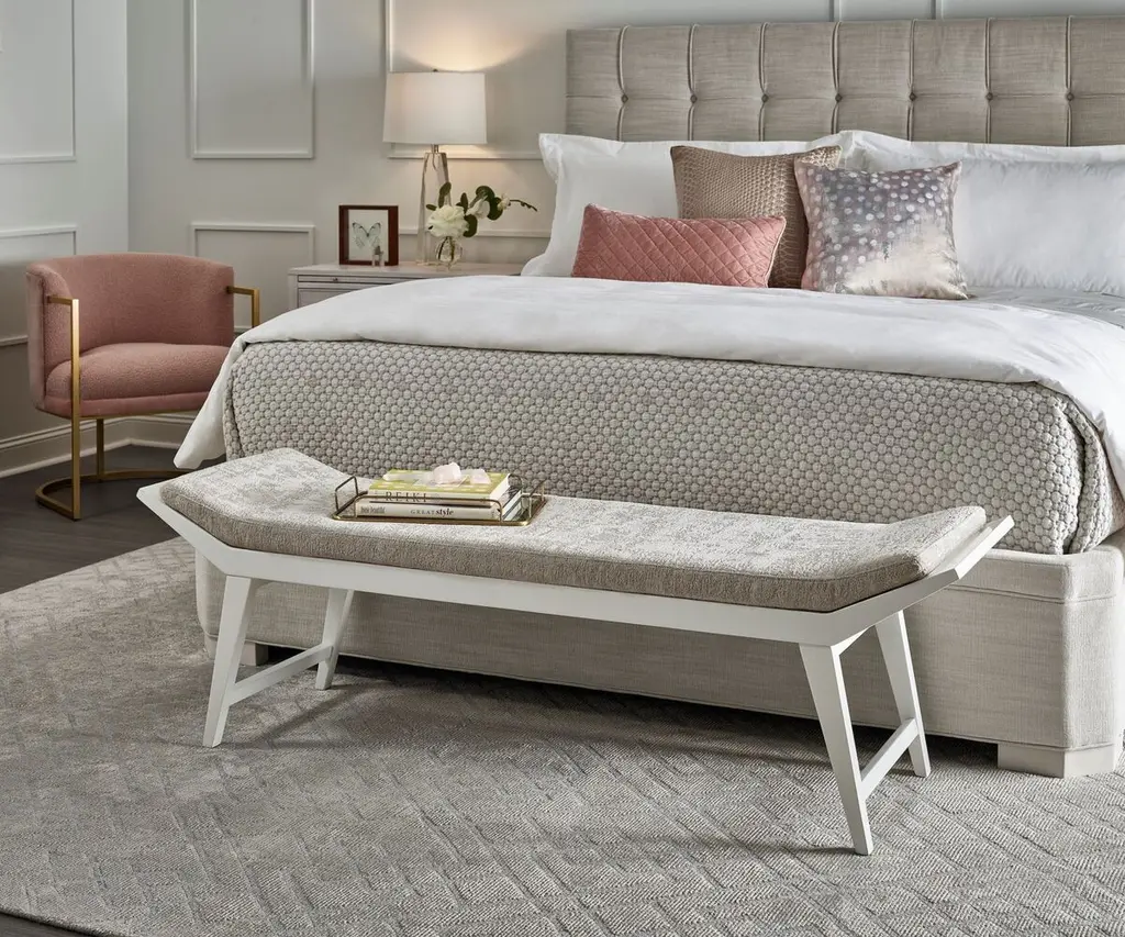 Off-white upholstery covers both the base and the headboard of this timelessly elegant bed. Button tufting makes the headboard especially inviting to lean against while you read or watch TV.