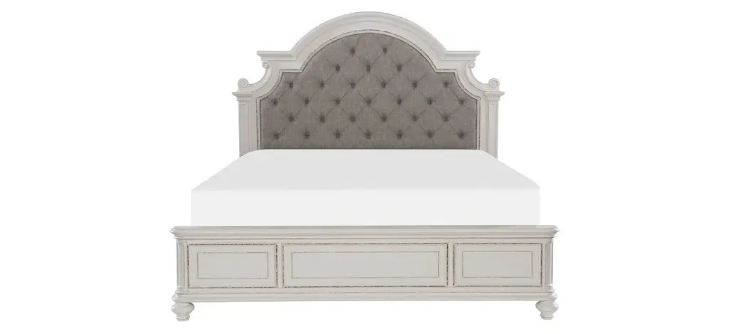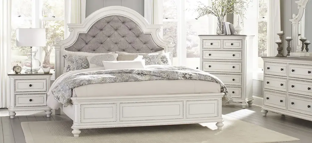 Soft, sweeping curves define the elegant profile of the Urbanite Collection. The bedroom is softened by an antique white rub-through finish with browngray finished framed-plank case good tops, creating a romantic aesthetic will place beautifully within your bedroom. Dark gray pleated, button-tufted fabric provides stunning contrast to the look of the bed, while dark finished metal knob hardware provides complementing contrast