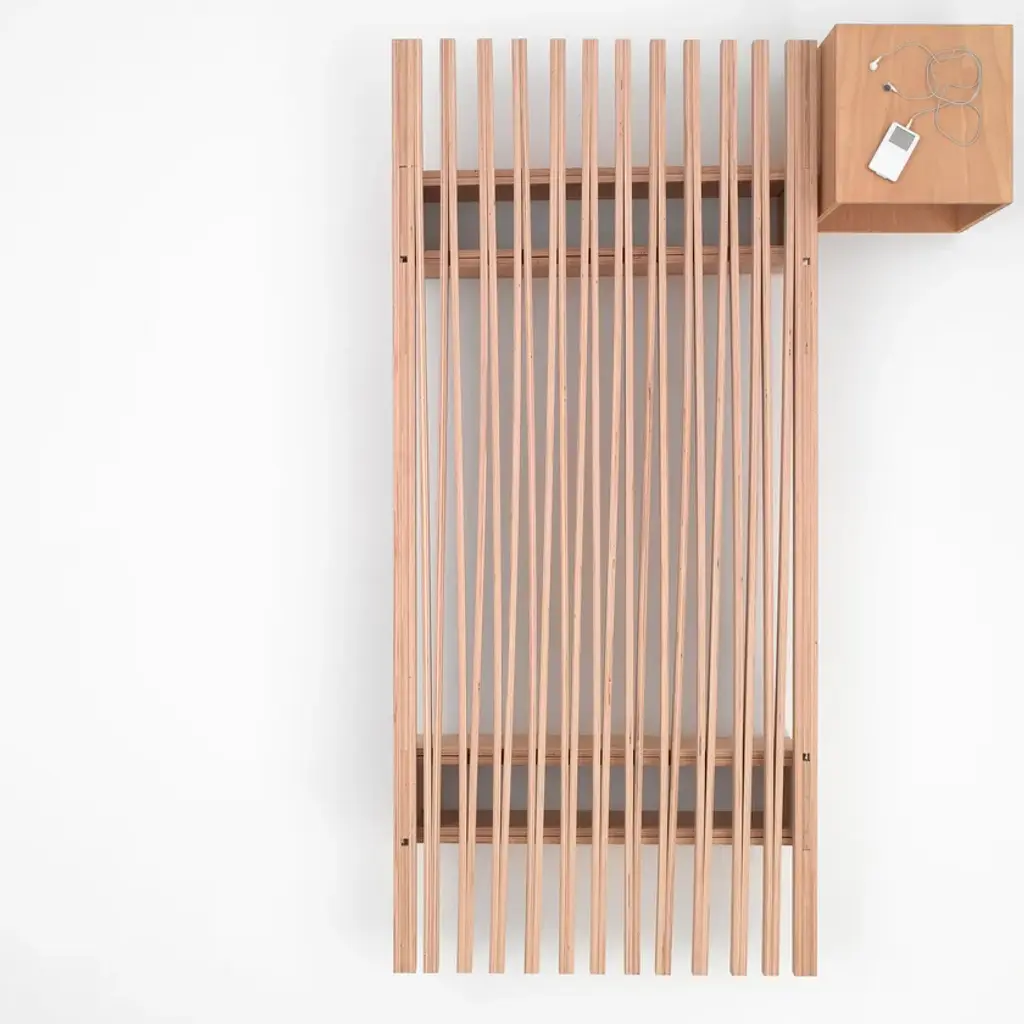 V...can be extended like an accordion to any desired width between 36 and 70 inches. As your children grow up the V-bed will grow with them and can serve as either a child-, teenage-, student-, queen size- or king size - bed. If used as a guest bed, it will provide enough room to comfortably accommodate one or two people.The V-bed can easily be put up and dismantled without tools and in no time at all. The materials of the bed are all environmentally friendly, no screws, mountings, varnish or paint - purely natural. Material: beech multiplex, untreated size variable between 35.4 and 70.9 x 78.9 inches Award2002 International Design Award, Design Center Stuttgart