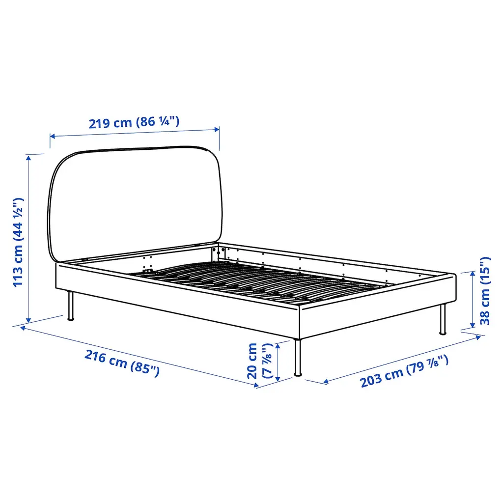 VADHEIM Upholstered bed frame - Gunnared light green King. VADHEIM has a clean design that makes it easy to match with other bedroom furniture. The rounded, padded headboard is both beautiful to look at and comfortable to lean on. Slatted bed base and midbeam are included.