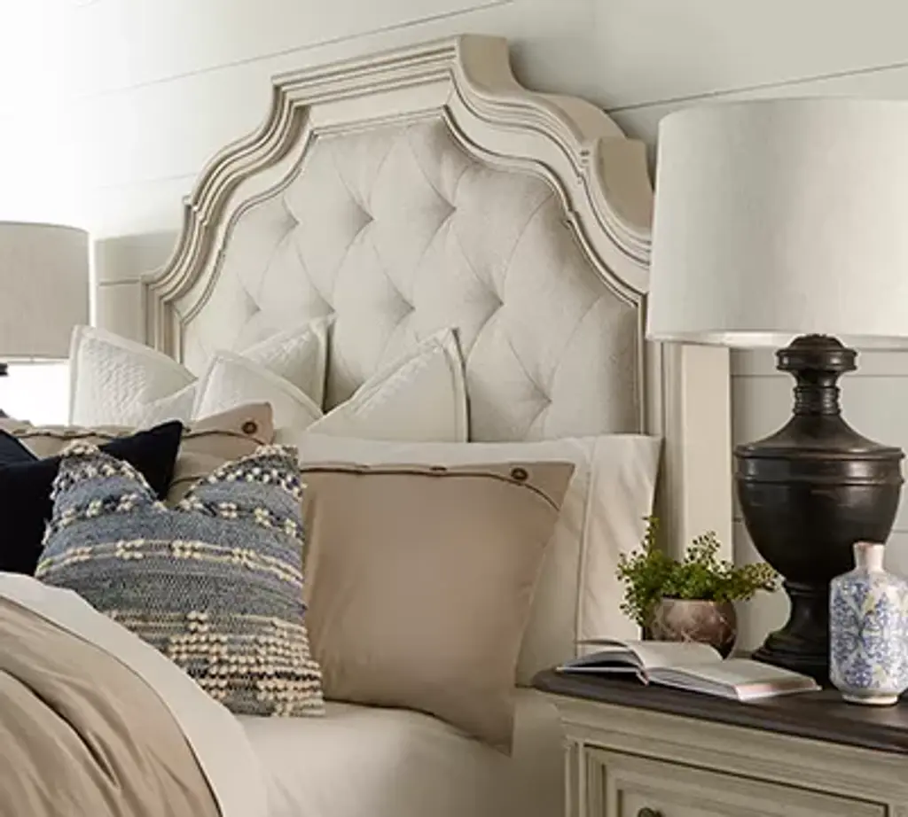 Give your bedroom a statement piece with our grandiose Veranda bed. Tufted upholstery framed in a carved headboard is complimented by hickory paneling in the footboard. An antique cream finish brings depth and character to the look. Use the information below along with the height of your mattress to select the right foundation for your new bed. Our Havertys sleep experts can also help you select the perfect mattress for your sleep needs.