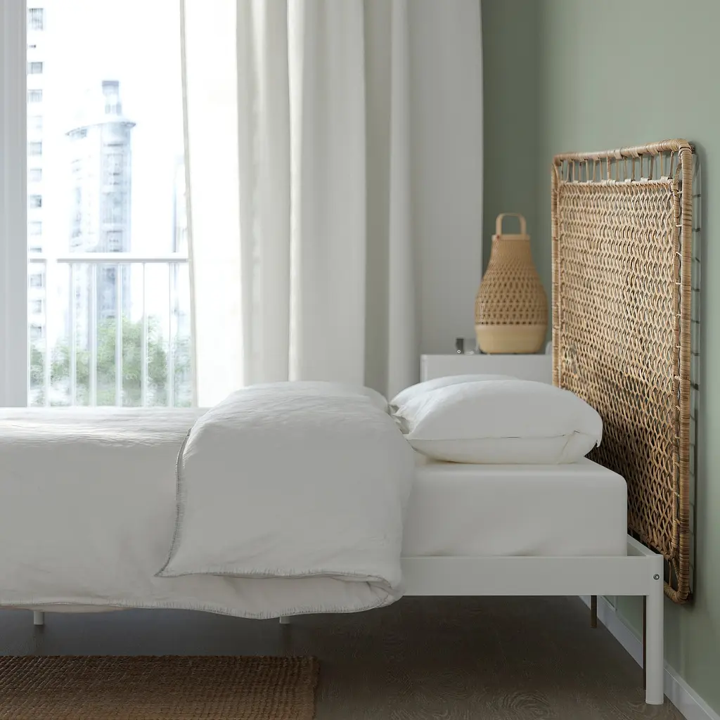 VEVELSTAD Bed frame with 2 headboards - white/Tolkning rattan King. White powder-coated metal and visible screws add a modern look to the bed frame. The legs of the headboard are designed to fit walls both with and without a skirting board. Mattress and bedlinens are sold separately.