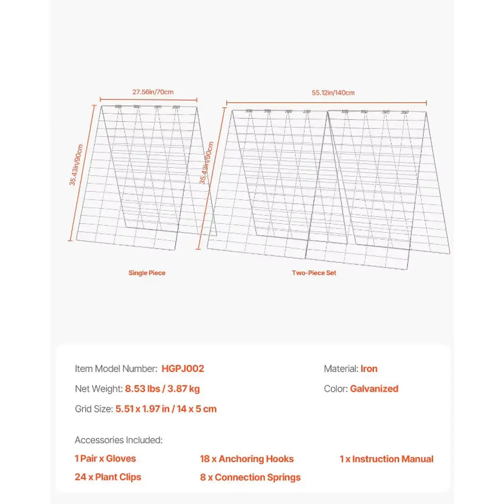 Feature: Promotes Plant Growth: The A-frame cucumber trellis provides ample space on both sides for planting various crops. Its design allows for optimal airflow, enabling climbing plants to receive plenty of sunlight, which enhances photosynthesis and helps ensure a bountiful harvest. Sturdy and Durable: Made with robust steel wire and coated with a powder-coated rust-resistant finish, this garden trellis for climbing plants is built to withstand various weather conditions. It is durable for long-term outdoor use, resistant to tipping, deformation, and cracking. Easy to Use and Store: Tool-free assembly makes setup quick and hassle-free. When not in use, the A-frame trellis can be easily disassembled and folded for compact storage. Versatile Application: Ideal for farms, gardens, and patios, this metal plant support trellis provides strong support for cucumbers, tomatoes, peas, zucchini, or other vining plants. What's Included: The package includes 4 metal mesh panels (27.56"W x 35.43"H), 1 pair of gloves, 18 fixing hooks, 24 plant support clips, 8 connecting springs and 1 instruction manual. Package Content: 1 Pair x Gloves 18 x Anchoring Hooks 24 x Plant Clips 8 x Connection Springs 1 x Instruction Manual