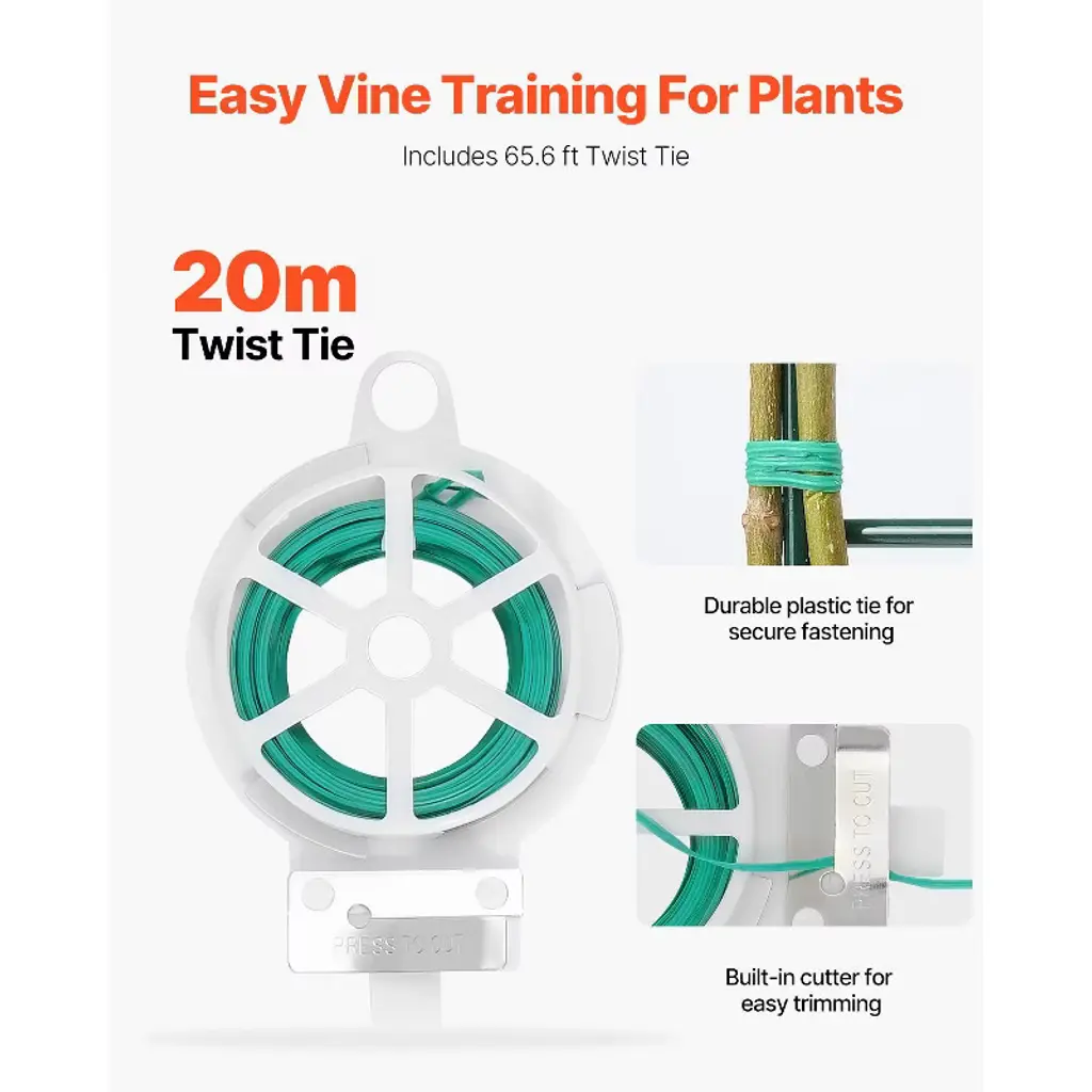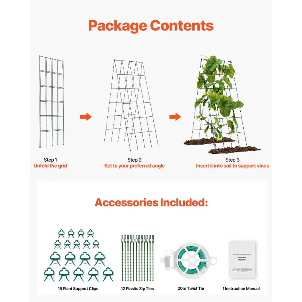 Feature: Promotes Plant Growth: The A-frame cucumber trellis provides ample space on both sides for planting various crops. Its design allows for optimal airflow, enabling climbing plants to receive plenty of sunlight, which enhances photosynthesis and helps ensure a bountiful harvest. Sturdy and Durable: Made with robust steel wire and coated with a powder-coated rust-resistant finish, this garden trellis for climbing plants is built to withstand various weather conditions. It is durable for long-term outdoor use, resistant to tipping, deformation, and cracking. Easy to Use and Store: Tool-free assembly makes setup quick and hassle-free. When not in use, the A-frame trellis can be easily disassembled and folded for compact storage. Versatile Application: Ideal for farms, gardens, and patios, this metal plant support trellis provides strong support for cucumbers, tomatoes, peas, zucchini, or other vining plants. What's Included: The package includes 4 metal mesh panels (15.75" W x 39.37" H), 18 plant support clips, 20m twist tie, 12 plastic zip ties, and 1 instruction manual. Package Content: 18 x Plant Clips 1 x 20m Twist Tie 12 x Zip Ties 1 x Instruction Manual