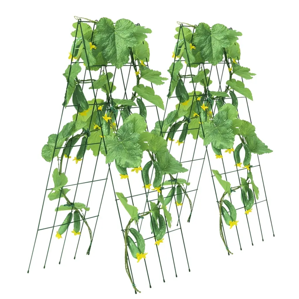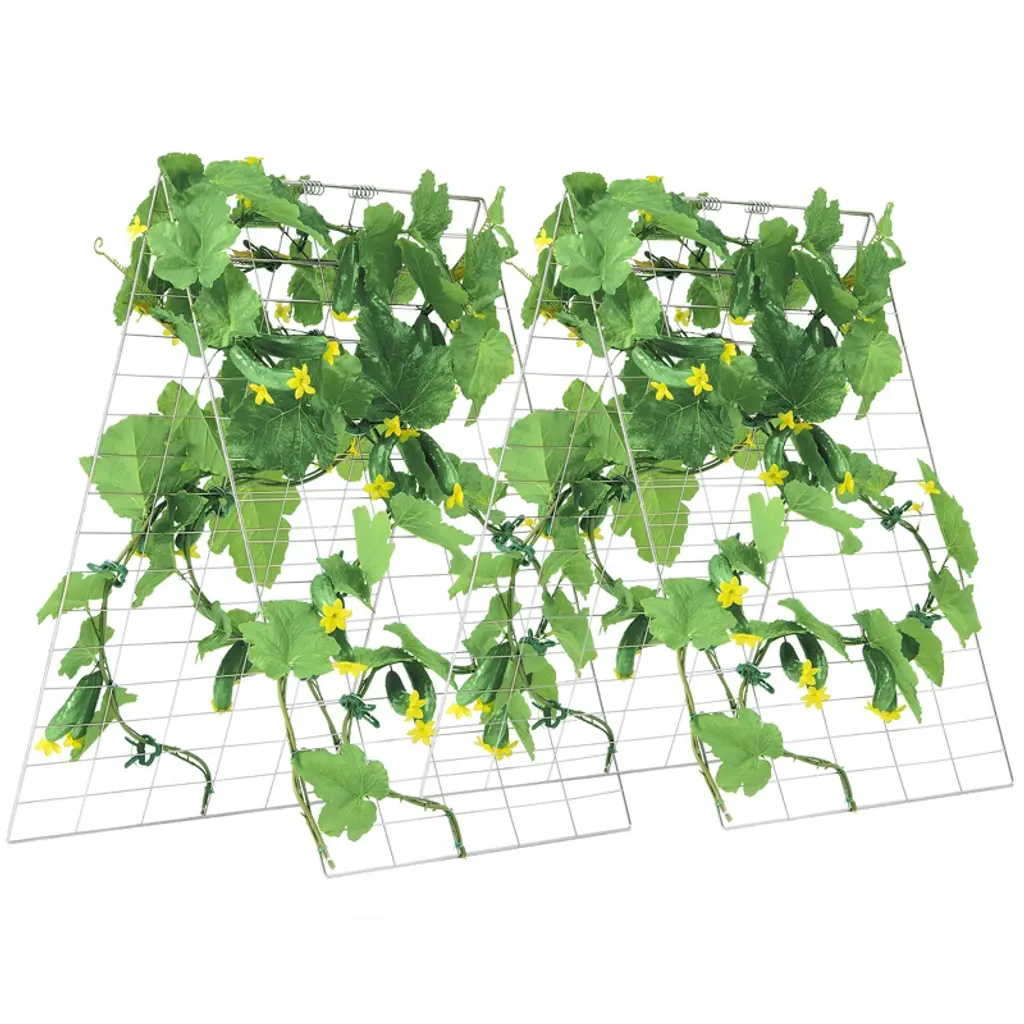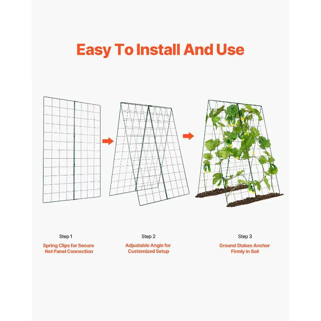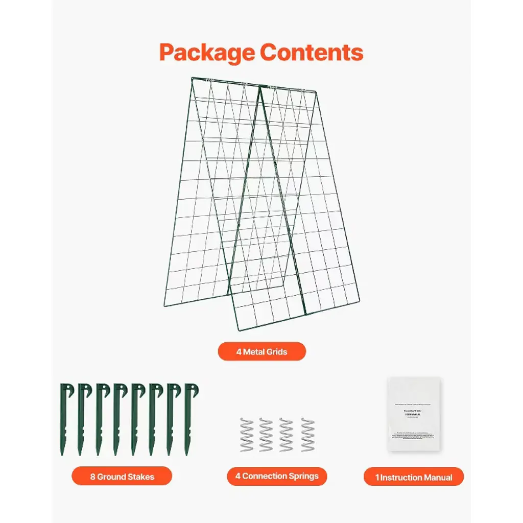 Feature: Promotes Plant Growth: The A-frame cucumber trellis provides ample space on both sides for planting various crops. Its design allows for optimal airflow, enabling climbing plants to receive plenty of sunlight, which enhances photosynthesis and helps ensure a bountiful harvest. Sturdy and Durable: Made with robust steel wire and coated with a powder-coated rust-resistant finish, this garden trellis for climbing plants is built to withstand various weather conditions. It is durable for long-term outdoor use, resistant to tipping, deformation, and cracking. Easy to Use and Store: Tool-free assembly makes setup quick and hassle-free. When not in use, the A-frame trellis can be easily disassembled and folded for compact storage. Versatile Application: Ideal for farms, gardens, and patios, this metal plant support trellis provides strong support for cucumbers, tomatoes, peas, zucchini, or other vining plants. What's Included: The package includes 4 metal mesh panels (16.54" W x 46.06" H), 4 metal grids, 4 connecting springs, 8 fixing stakes, and 1 instruction manual. Package Content: 4 x Connection Springs 8 x Ground Stakes 1 x Instruction Manual