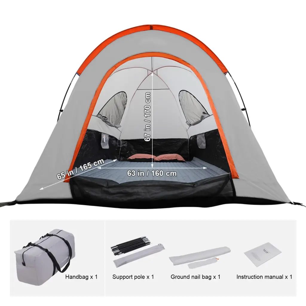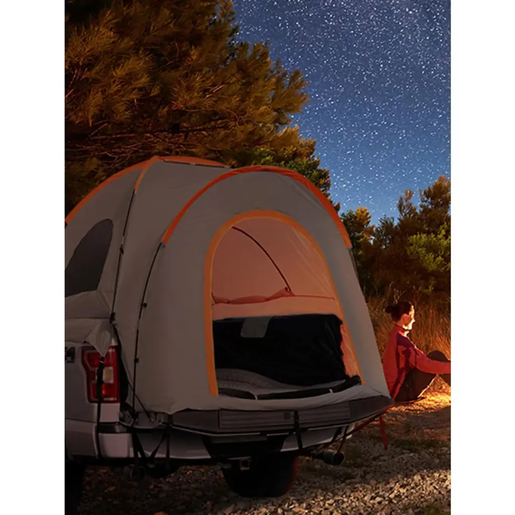 Feature: Compatible with Various Vehicles: Are you ready to get more out of your truck? The VEVOR pickup tent is suitable for pickup trucks with a 5.5-6 feet bed and is compatible with Ford F150, Dodge Ram 1500, GMC Sierra, Chevrolet Silverado, Nissan Titan, Toyota Tundra, and more. With this tent, you can turn your truck into a mobile "home" and enjoy outdoor camping fun with your family and friends. Stand up to Rain: The truck bed tent has a waterproof rating of up to PU2000. With a rainfly, our double-layer tent effectively prevents fierce wind and heavy rainfall. Additionally, it features a 120g fully sewn PE floor with a waterproof pressing process, which prevents the tent's interior from soaking, even during heavy rain. Safer and Sturdier: The truck bed tent boasts a streamlined design that reduces wind resistance. And it is equipped with thickened 9 mm fiberglass support poles that are corrosion-resistant and provide solid support. Our sturdy tent can withstand force 5 wind, ensuring your safety even in windy weather. Room for the Family: With a 5.58 feet headroom in the middle, the pickup truck tent provides a roomy space for a family to rest. High-density mesh windows prevent bugs from entering during the summer, and the small window in the outer tent enhances airflow, ensuring a more refreshing resting experience. Take on Any Challenge: Our truck bed tent is breathable and bug-proof, enabling you to enjoy the sky and maintain a clear view through the skylight. You can pull the rainfly outside the tent while you sleep. The double-layer design makes the tent resistant to cold and rain, ensuring a peaceful sleep. The dual usage allows you to adapt to the changing outdoor environment. Package Content 1 x Tent 19 x Hooks 1 x Carry Bag 1 x 4-section Support Pole 2 x 10-section Support Pole 1 x Support Rod Bag 1 x Rope 1 x Instruction