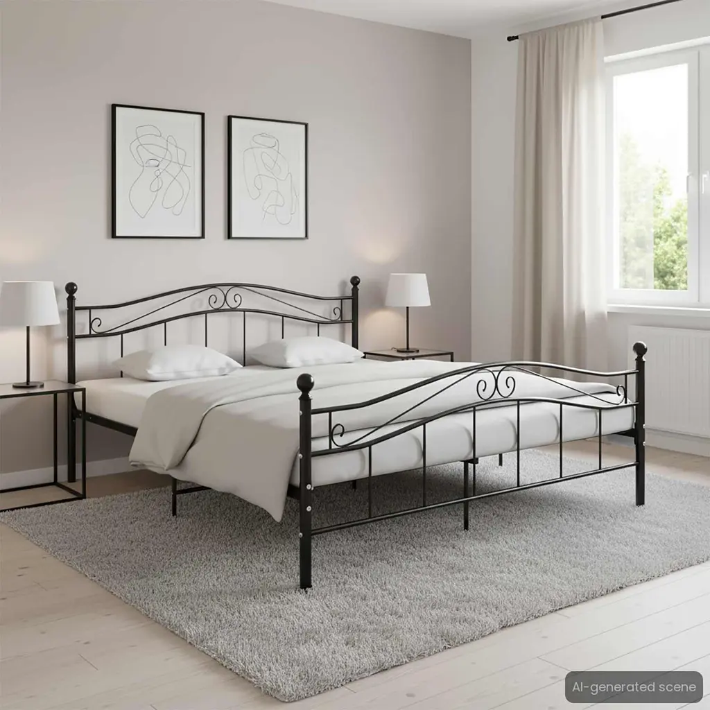 This bed frame mixes modern looks with practical use, giving you a stylish sleeping option for any contemporary bedroom. Made from durable, powder-coated steel, it has a sleek black design that fits in with all sorts of decor styles, making it a great addition to your living space while ensuring solid support for a good night’s sleep. Robust Construction: The bed frame is made from high-quality powder-coated metal, ensuring long-lasting stability and resistance to wear and tear. Stylish Appearance: Its smooth black finish not only enhances its modern look but also makes it a versatile addition to any bedroom decor. Simple Cleaning: The metal surface allows for effortless upkeep; just wipe it down with a damp cloth to maintain its pristine appearance. Available Size: Designed to accommodate a standard double-sized mattress measuring 55.1 x 78.7 in, providing ample space for restful sleep. Easy Assembly: The bed frame comes with straightforward instructions, allowing for quick setup with common tools.
