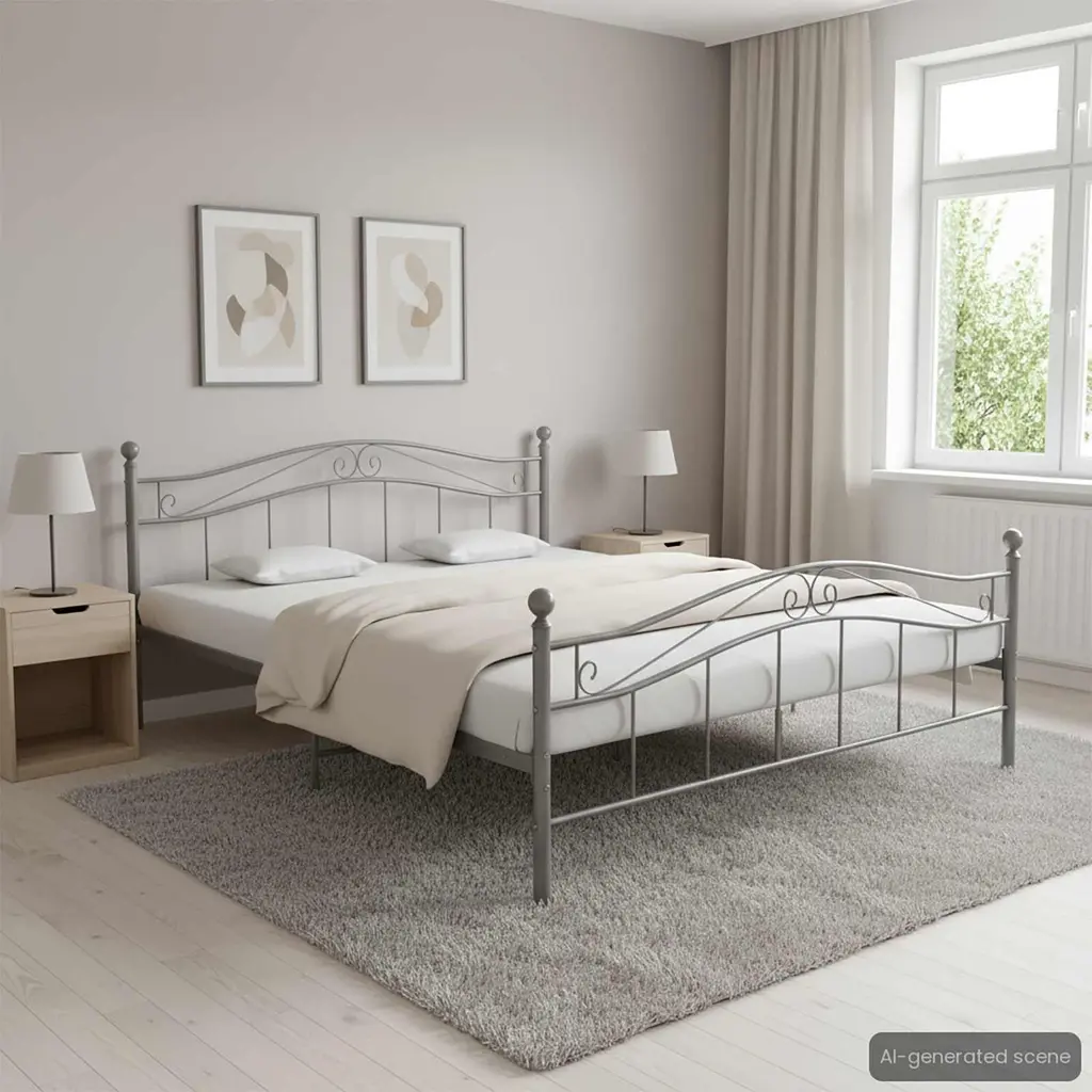 This double metal bed frame adds a modern flair to your bedroom, blending style with purpose. Made from sleek gray powder-coated steel, it boosts the room's visual charm while ensuring a comfortable night's sleep for couples or anyone who likes a bit of breathing space. Durable Material: Made from strong powder-coated steel, this bed frame is set to survive daily use while keeping its good looks, making it a long-lasting addition to your space.Stylish Gray Finish: The sleek gray color sets a calming vibe, fitting in nicely with different decor styles, and elevating your bedroom's overall feel.Spacious Dimensions: At 63 in wide and 79 in long, this bed frame offers loads of room for a comfy sleep, great for two adults wanting a restful night.Supportive Leg Design: With solid square legs, the bed frame is stable, reducing any wobble or movement while you sleep, giving you peace of mind.Easy to Assemble: With clear assembly instructions, putting your new bed frame together is a walk in the park, letting you enjoy your new bedroom feature in no time.