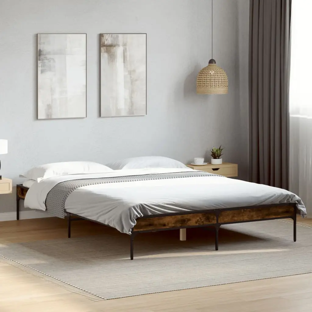 This modern double bed frame combines style with functionality, perfect for a contemporary bedroom or guest room. Made from high-quality engineered wood with a stunning smoked oak finish, it fits in well with various decor styles, offering both elegance and durability to your space. Durable Material: Built from strong engineered wood for a stable base for up to two people, ensuring comfort and support through the night.Metal Leg Design: With robust metal legs for better stability and a sleek, modern look that fits any contemporary space.Easy Maintenance: Just wipe down with a dry cloth to keep it looking fab with minimal effort.Versatile Use: Perfect for bedrooms or guest rooms, this bed frame works with various mattress types, providing a comfy spot for sleep.Optimal Size: Measuring 53.1 x 74.8 in, it has enough space for couples or individuals while fitting snugly into any room.