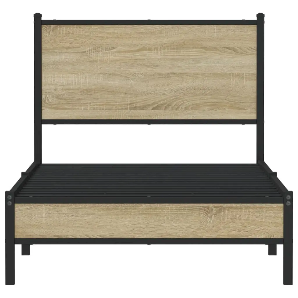 This Metal Bed Frame with Headboard makes a strong statement in any bedroom or guest room, mixing style and practicality for a better sleep experience. With its trendy Sonoma Oak finish, it easily matches different decor styles while providing solid support for a good night's sleep. The modern design features sleek lines and a sophisticated Sonoma Oak finish, making it an ideal centerpiece for bedrooms. Built with a durable frame from high-quality steel, this bed frame offers stability and longevity without sacrificing style. Perfect for compact spaces, the small dimensions allow it to fit neatly in a variety of room layouts while providing a generous sleeping area. Assembly is a breeze, as each unit comes with detailed instructions and all necessary tools for a hassle-free setup. Designed to support a mattress directly—no box spring required—this makes it not just functional but ideal for a clean, neat look.