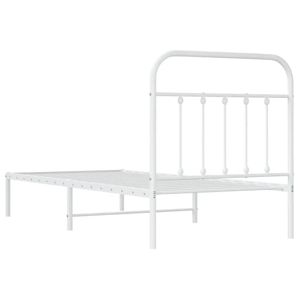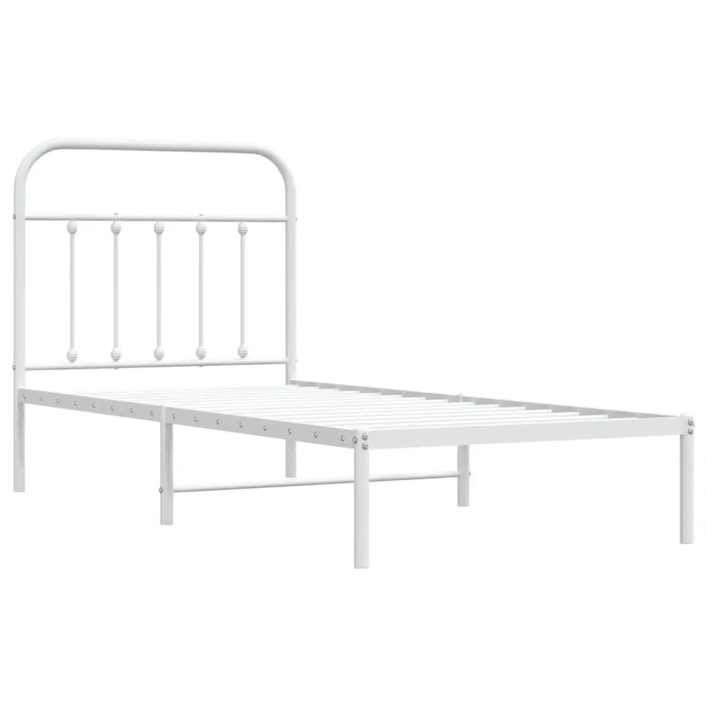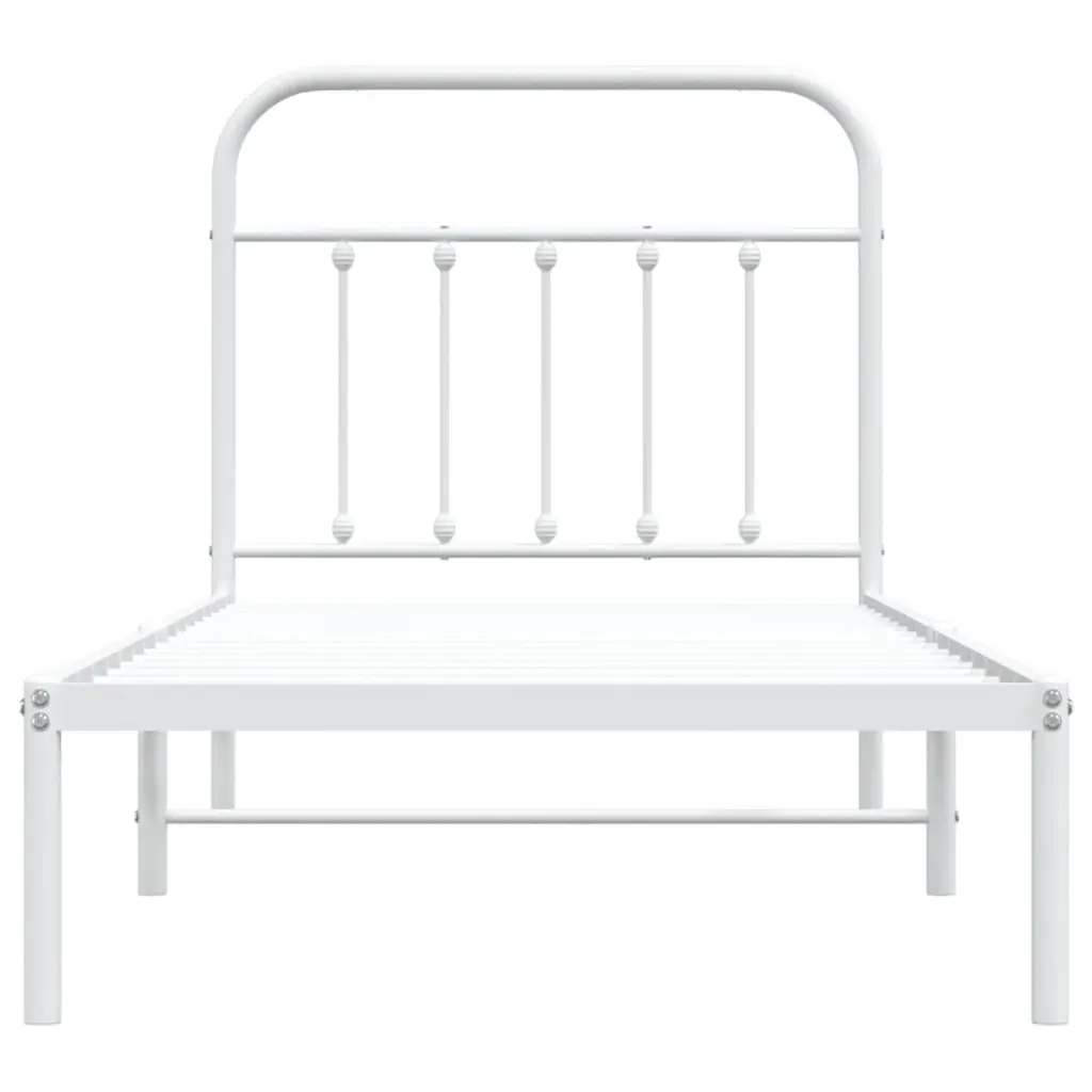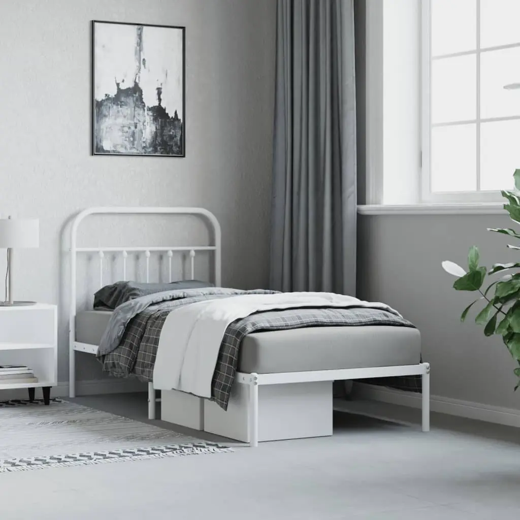 This single metal bed frame with headboard combines functionality and style, creating the perfect atmosphere for restful sleep and relaxation. With an industrial look, its smooth, powder-coated white finish presents a sleek and clean appearance that fits seamlessly in modern bedroom or guest room settings, providing an inviting space for rejuvenation and comfort. The tough metal design ensures it lasts, able to handle daily use without a problem.Assembling is a breeze, just grab a screwdriver and two people can have it up in no time, making the whole process quick and easy.With loads of storage space, it’s perfect for tidying up your bedroom while adding to that trendy industrial look.Made for one, this bed frame is tailored for single use, making it perfect for compact spaces or minimalist living.Measuring 35.4 in wide, 78.7 in long, and 39.4 in high, this bed frame fits snugly in tight rooms while giving you plenty of space to sleep.