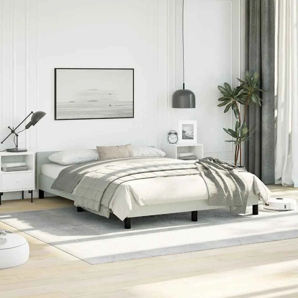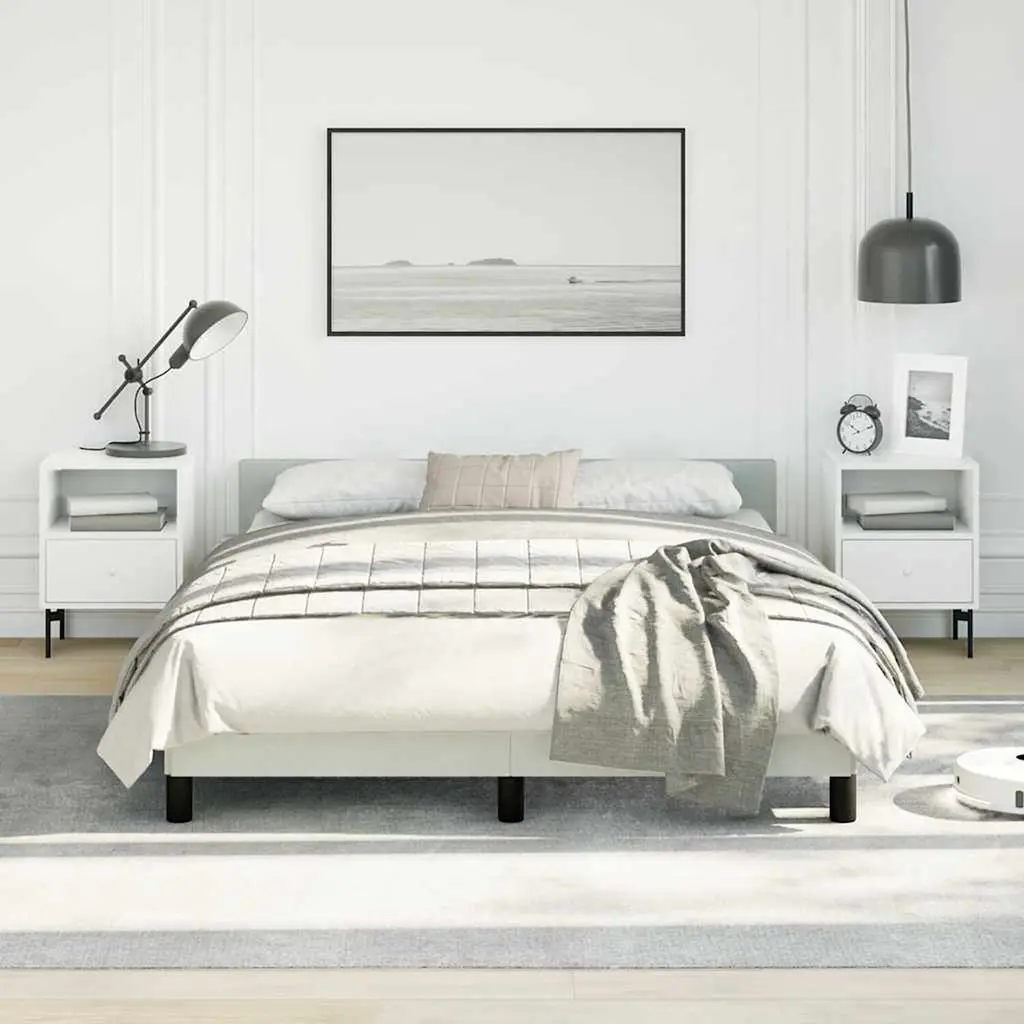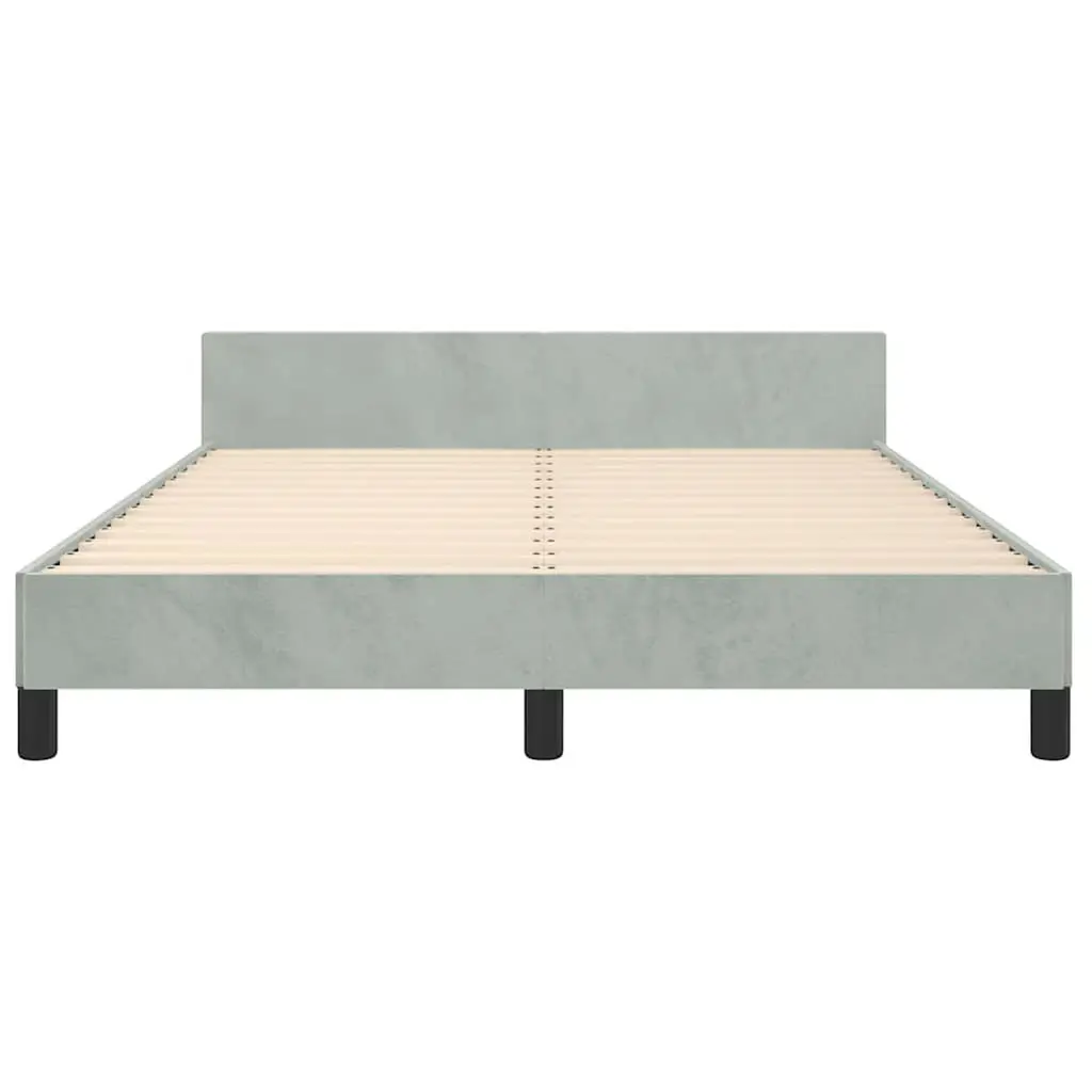 This Light Grey Velvet Bed Frame brings style and comfort to any bedroom with its cool blend of modern design and luxurious materials. Its sleek, contemporary look is topped off by a soft, velvety surface, making it a classy focal point while providing a cozy spot to rest. Modern Aesthetic: This bed frame has a clean look that matches loads of decor styles, making your bedroom even nicer.Velvet Upholstery: Made with lush velvet fabric, this frame is not only pleasing to the eyes but also super soft, creating a comfy sleep space.Robust Construction: Built from engineered wood, this bed frame securely holds a double mattress while lasting long.Comfortable Fit: The roomy design holds a double mattress perfectly, letting you sleep comfortably.Versatile Color: The light grey shade fits into any color scheme, making it a breeze to match with your current decor.