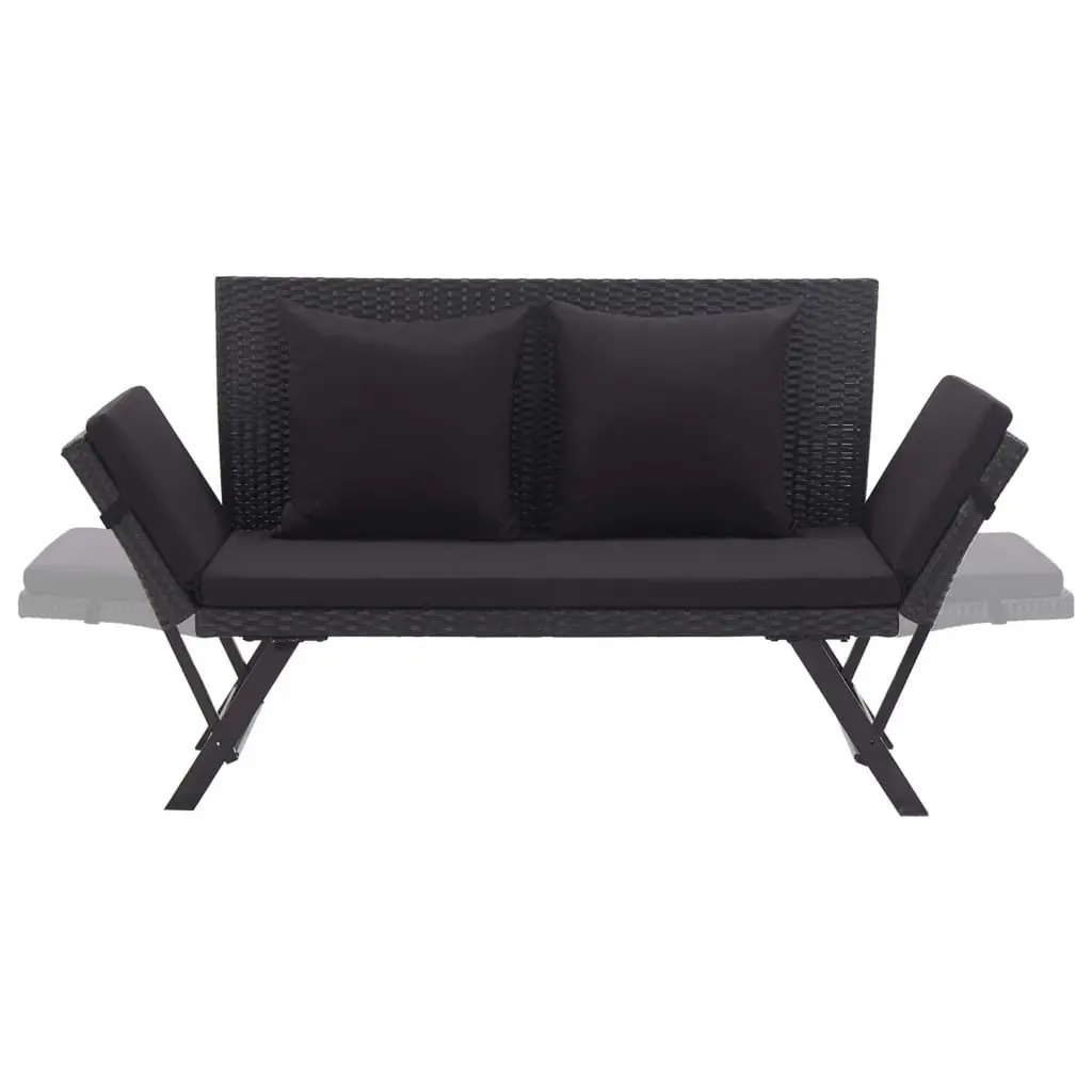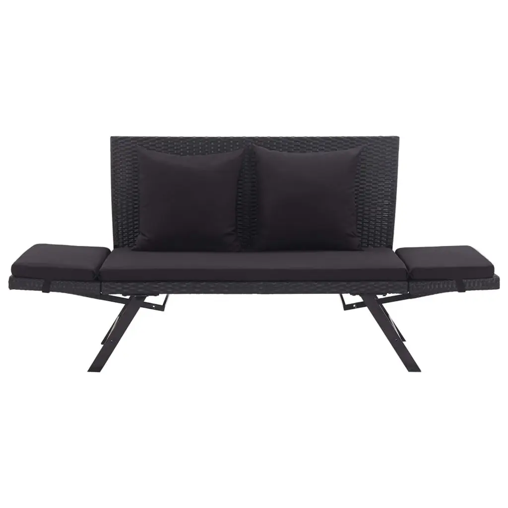 This outdoor patio garden bench is a lovely mix of comfort and style, designed to make your outdoor space shine. With its minimalist black design, it fits in perfectly with any garden, balcony, or patio, functioning not just as a nice seating option but also turning into a sun lounger for those sunny days. Includes 2 cushions, making it more comfy for long lounging sessions Made from UV-resistant synthetic rattan, built to last outside Convertible feature lets it change from a bench to a sun lounger for extra use Adjustable armrests for a comfy fit for everyone Stylish powder-coated steel frame gives it stability while adding a modern flair