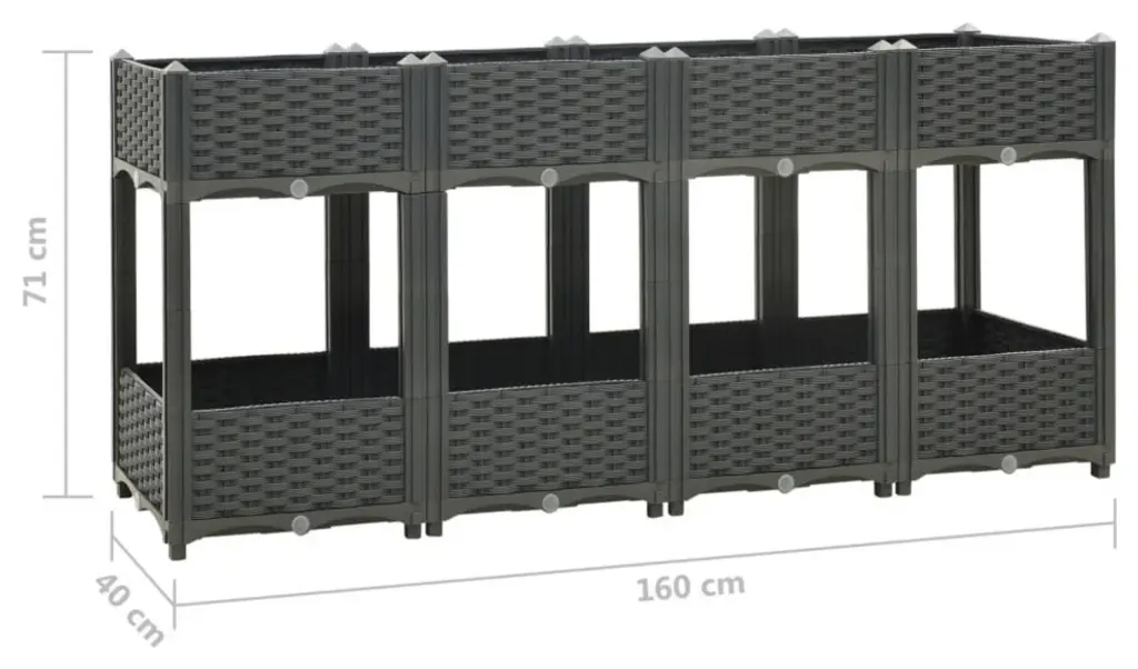 vidaXL Raised Bed 63"x15.7"x28" PolypropyleneThis raised bed would be an excellent choice for DIY enthusiasts to decorate their gardens, balconies or patios. This planter, featuring 2 shelves, is made of polypropylene, making it sturdy, hard-wearing and suitable for daily outdoor use. The garden pot is deep and wide enough to hold a large amount of soil and provides ample space for your plants, vegetables, herbs and flowers. Create a lovely backdrop for your plants with this elegant planting bed!Color: Dark grayMaterial: PP (polypropylene)Dimensions: 63" x 15.7" x 28" (L x W x H)Assembly required: Yes