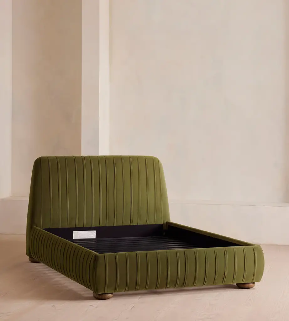 Inspired by our members' favorite Vivienne sofa on the eighth floor of White City House, the Vivienne bed is a reiteration of our House icon with pleated stitch detailing on the headboard as a play on texture. Upholstered in rich velvet, it rests on oversized solid oak bun feet and is designed to be the focal point of your bedroom to build around with other prints and fabrics.