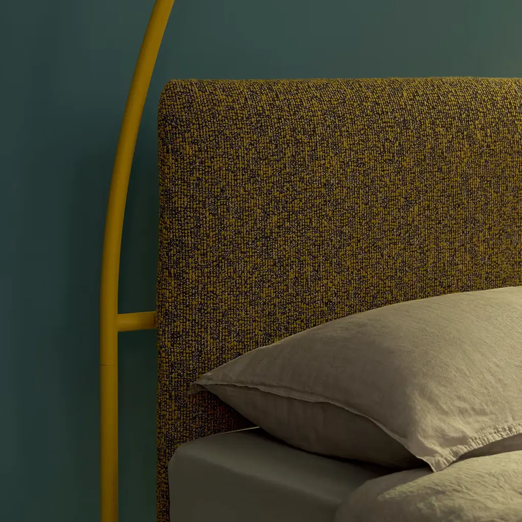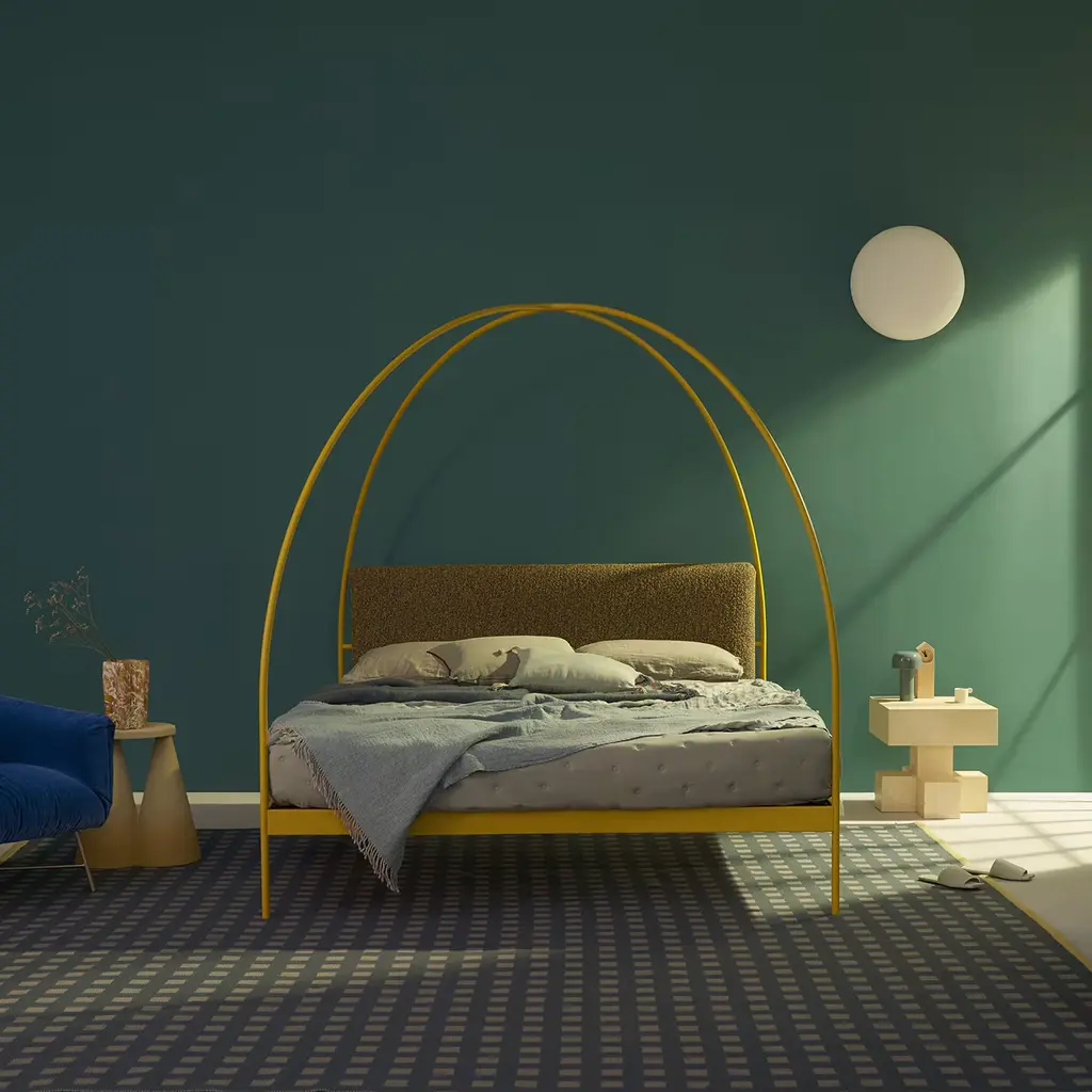 Volta takes up and reworks the classic dome shape in its profiles, making it light and minimal: the arches are generated by round iron tubes and softly envelop the bed as if to suggest a sense of intimacy and protection. The entire construction converges into a single joining element at its top. The LED light is located exactly at Volta’s zenith. The LED light is located exactly at Volta’s zenith. Bed base included. The mattress is not included.