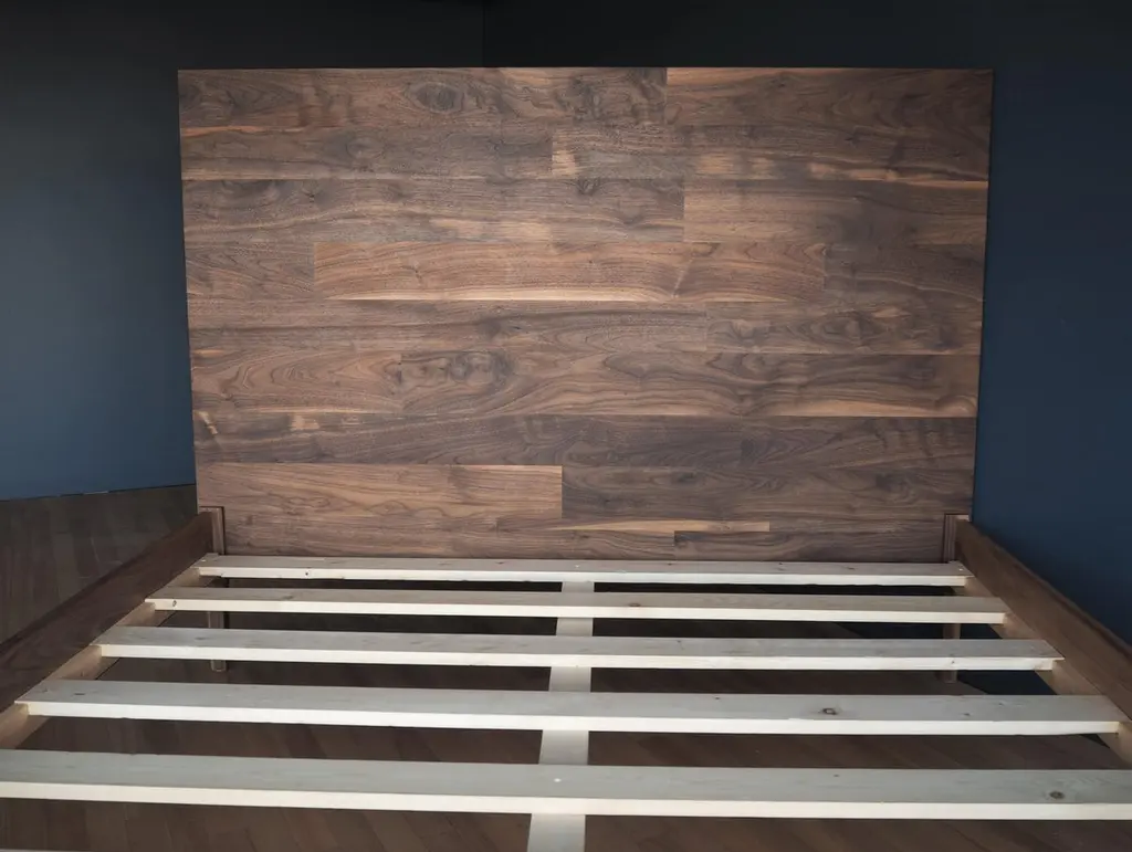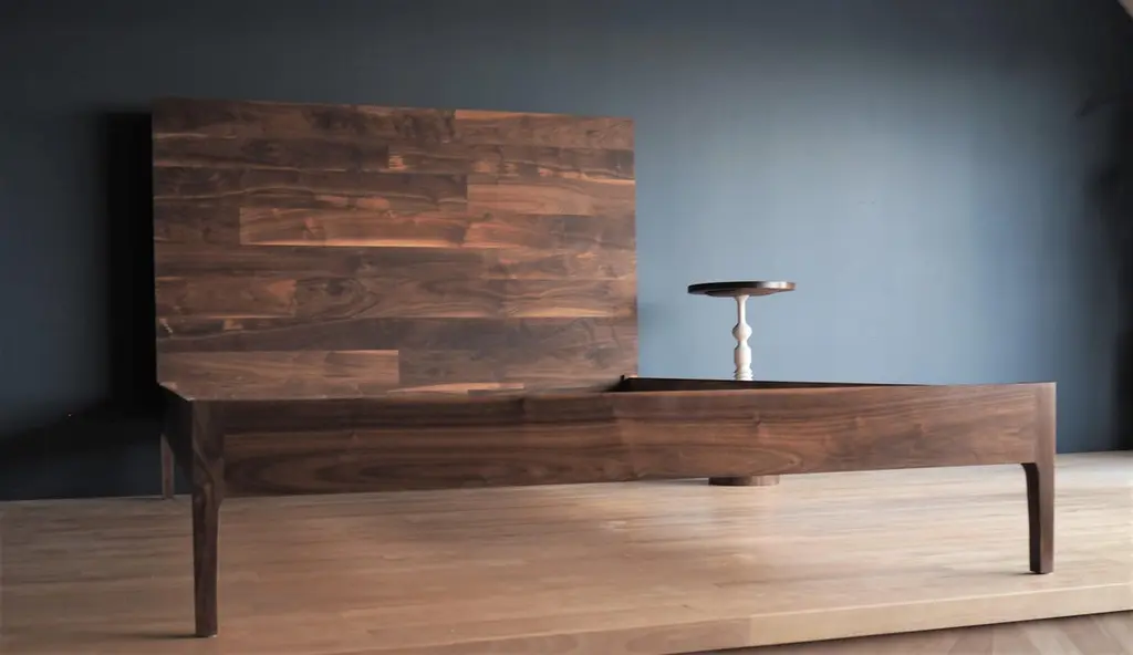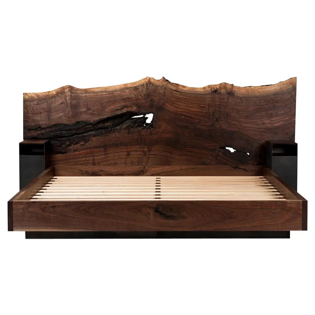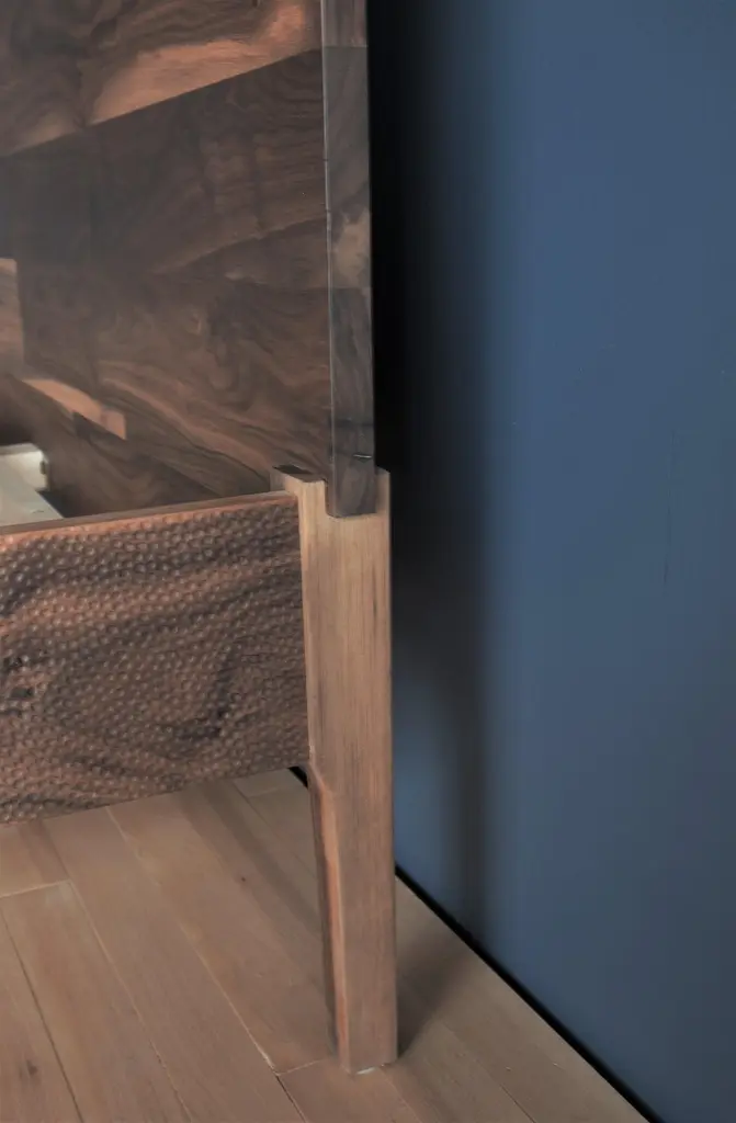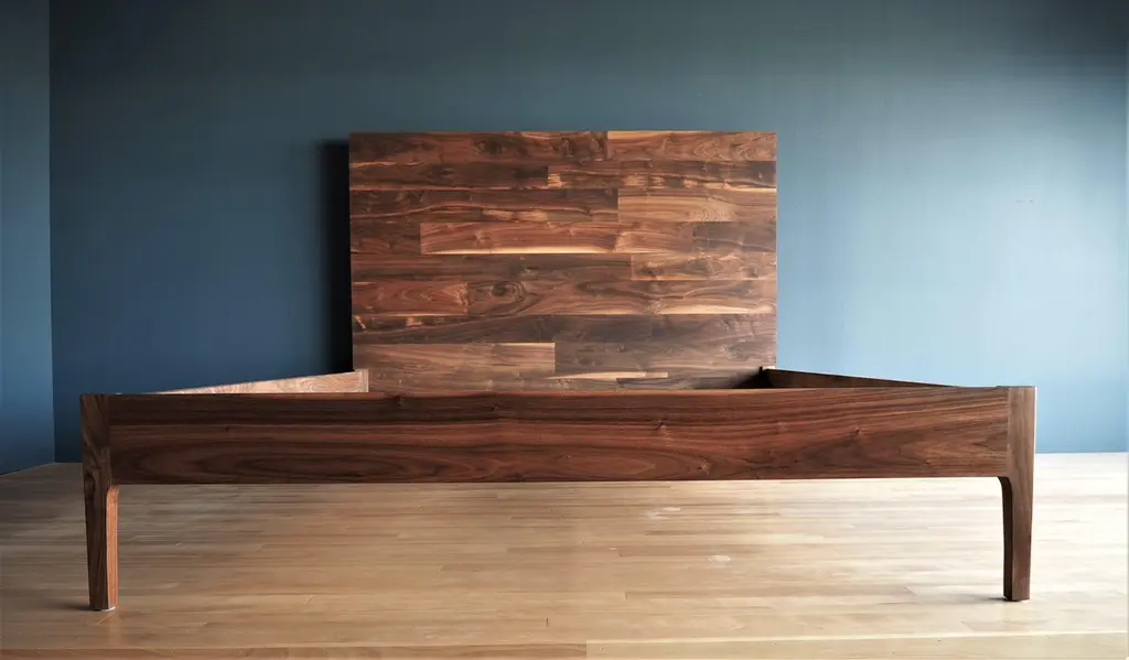Our walnut high back bed is constructed out of North American solid black walnut. The bedside railings are hand carved to add texture and character.The bed frame is constructed with self tightening clasps and can be taken apart for easy transport.