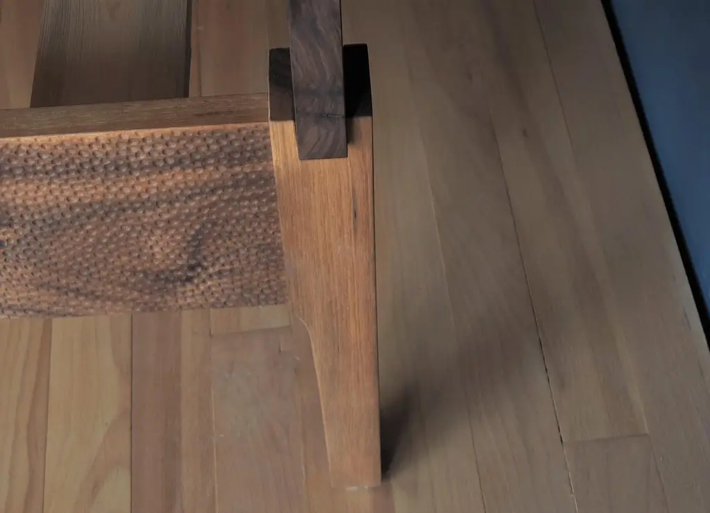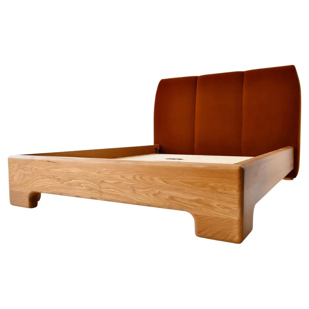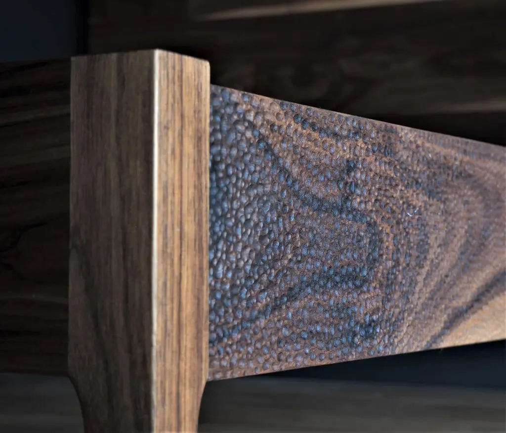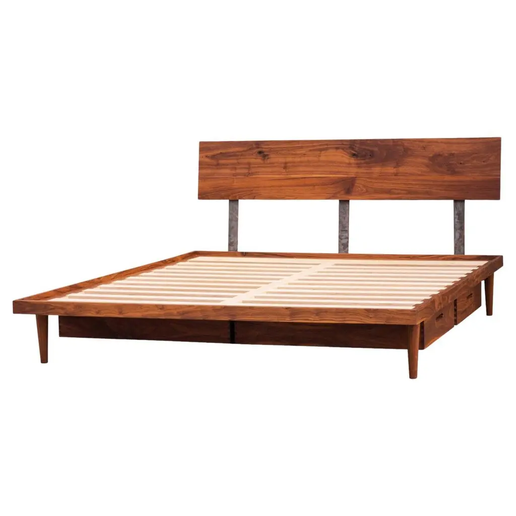 Our walnut high back bed is constructed out of North American solid black walnut. The bedside railings are hand carved to add texture and character.The bed frame is constructed with self tightening clasps and can be taken apart for easy transport.