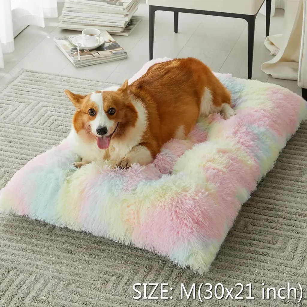 Washable Plush Dog Crate Bed Fluffy Cozy Kennel Pad,with Anti-Slip Bottom,rainbow - Rainbow - Xl(41x27 Inch)
