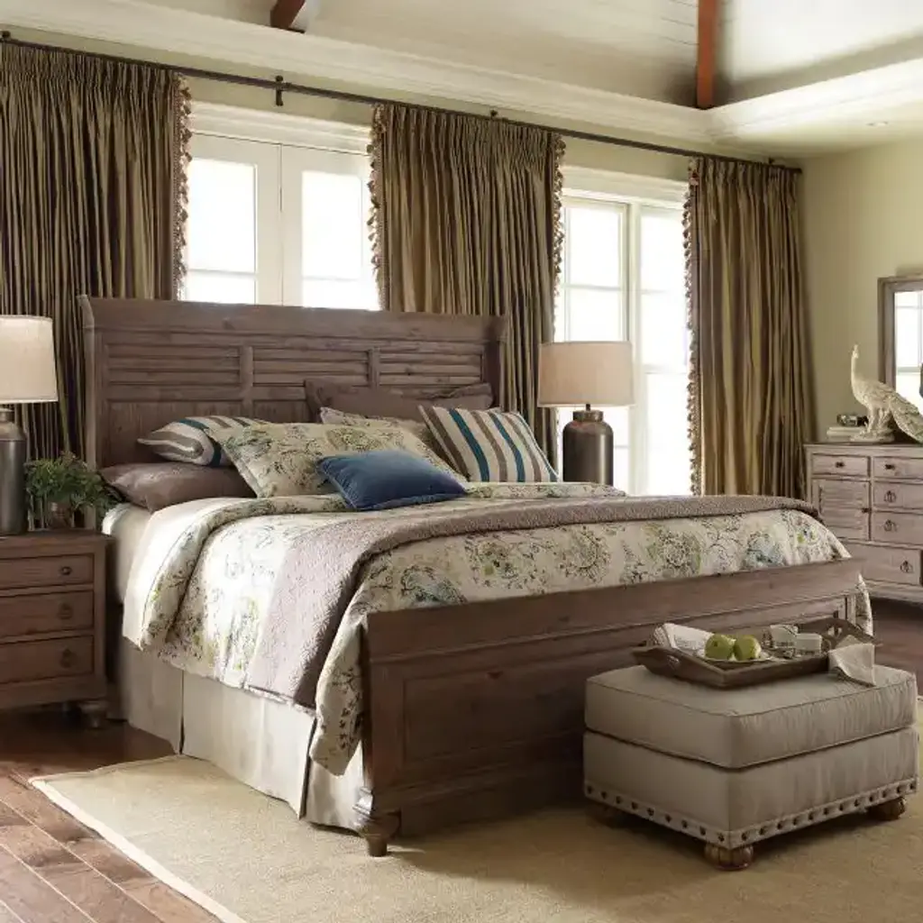In terms of scale, the Shelter Bed is the larger bed in the Weatehrford collection. It is a great bed for adding depth to a large master bedroom with design elements like the shelter posts, framed solid wood panels, slatted panels and shaped top rail. The Shelter Bed is available in either King or Queen size.
