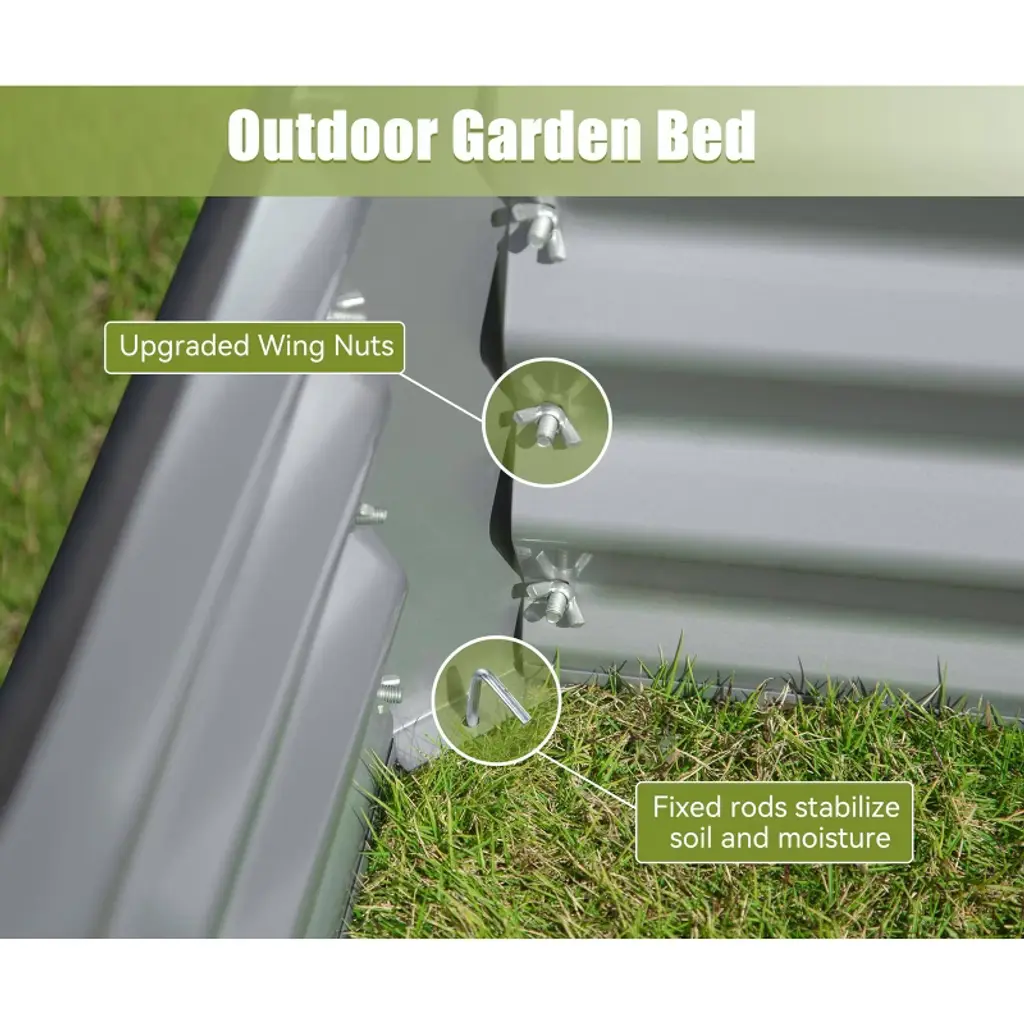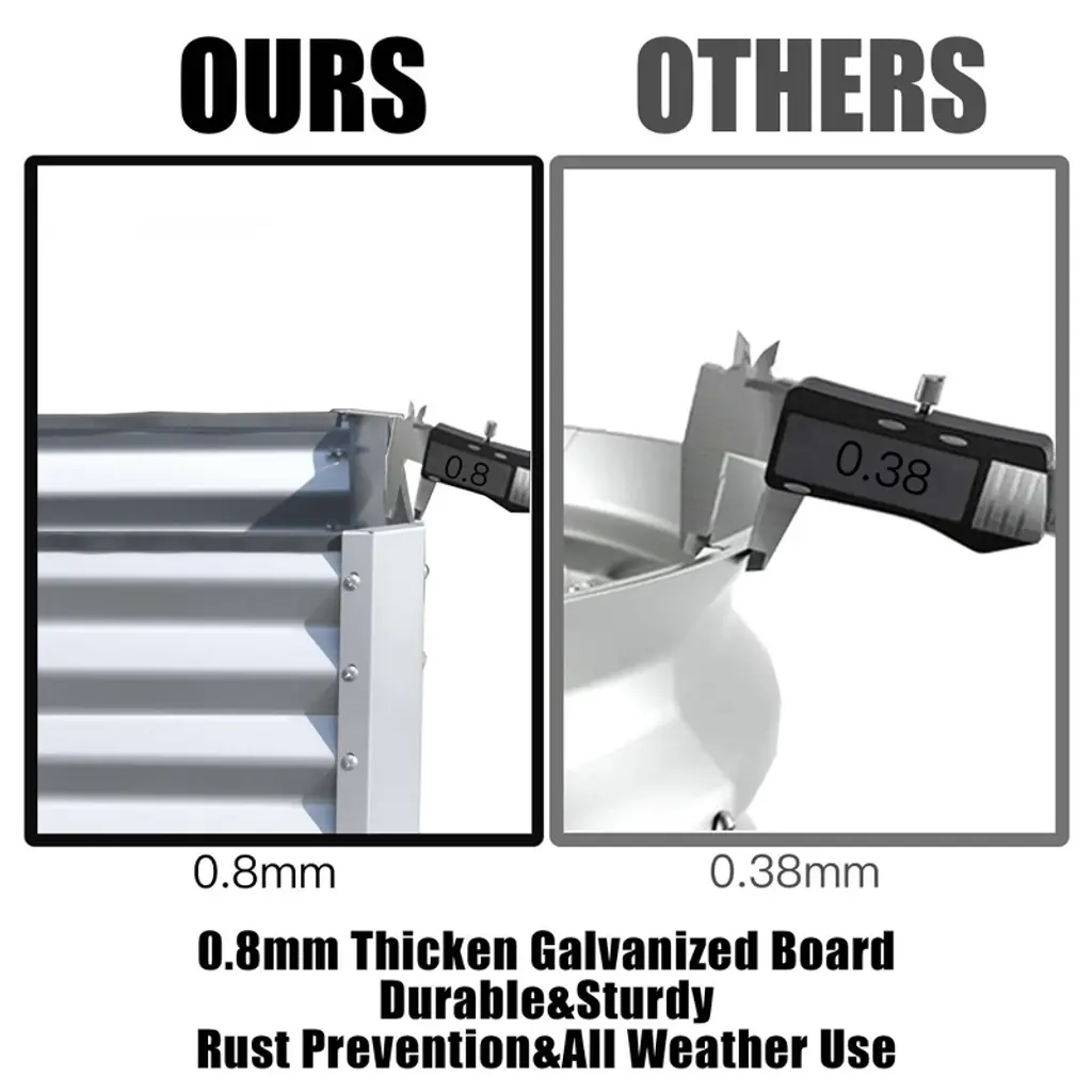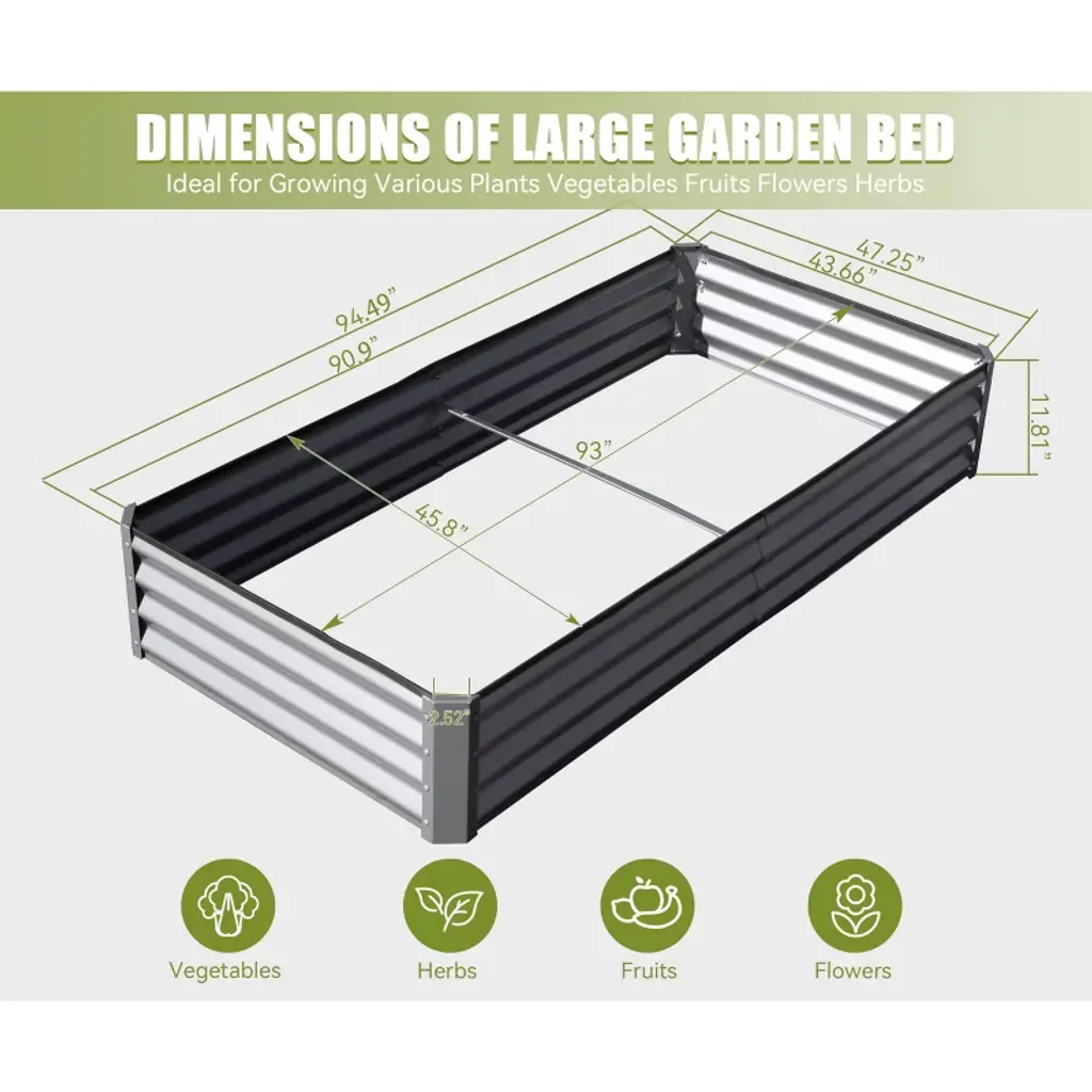 Create the perfect home garden with this 8x4x1 ft galvanized raised garden bed. Crafted from powder-coated galvanized steel, it’s built to resist rust and endure diverse weather conditions season after season. The spacious design provides plenty of room for vegetables, flowers, fruits, and herbs, while the open base encourages excellent drainage and natural root expansion. Reinforced support rods ensure the sides stay secure and straight, and the thickened safety edge helps protect your hands during planting. Simple to assemble and built to last, this raised bed makes growing a healthy, thriving garden easier than ever.