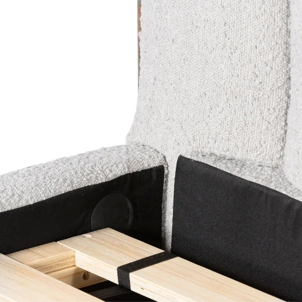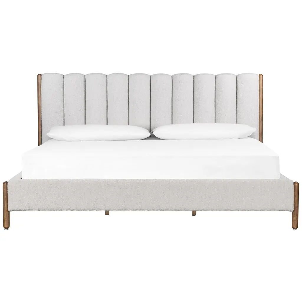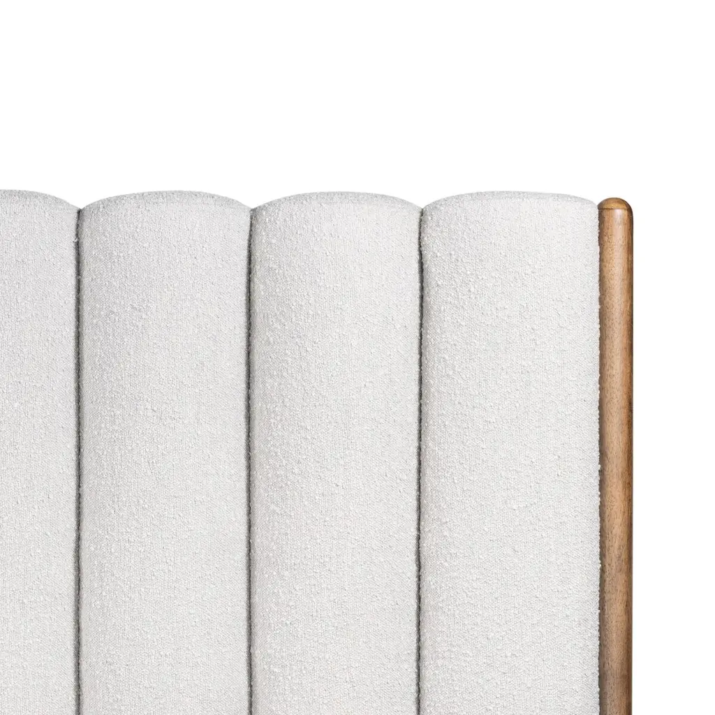 The headboard's vertical channeling gives this bed a luxuriousness that's complemented by the bouclé upholstery. Rounded parawood legs add contemporary ease. Because the bed comes with a slat support system, a box spring is not needed.
