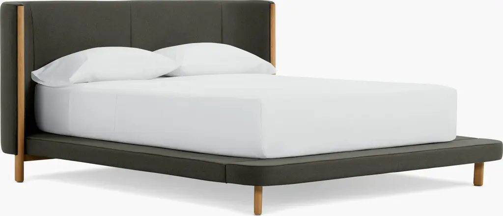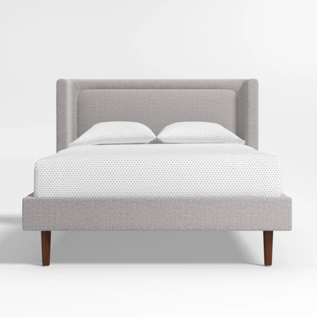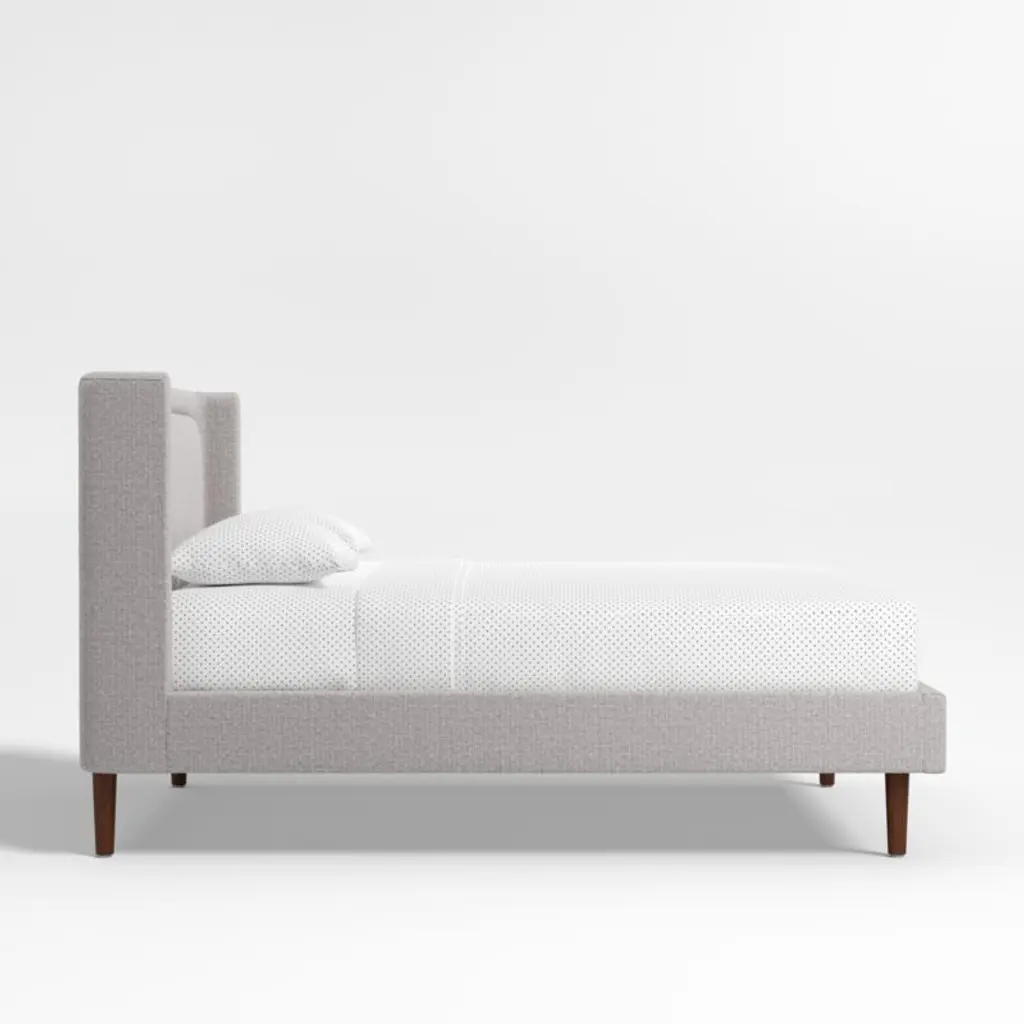 Curving gently, the shelter headboard of our Weston Grey Upholstered Bed offers a cozy haven for kids. The padded, upholstered headboard provides a comfy spot for lounging and reading, and the tweedy pale grey fabric wraps the entire bed frame for complete softness. Tapered solid wood legs add a bit of a lift plus a touch of natural warmth. This cool, modern design will grow with little ones through each stage.
