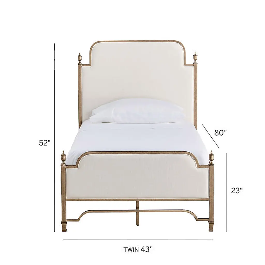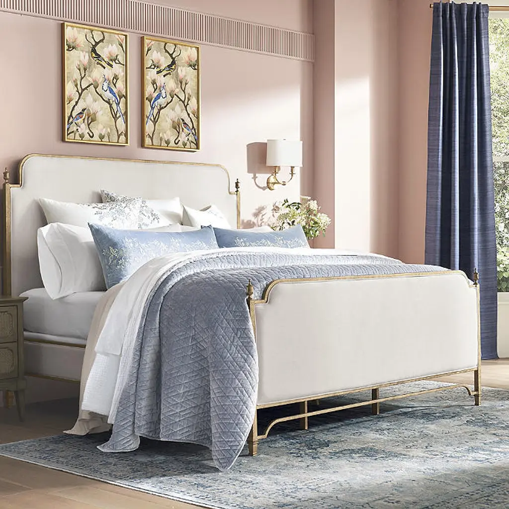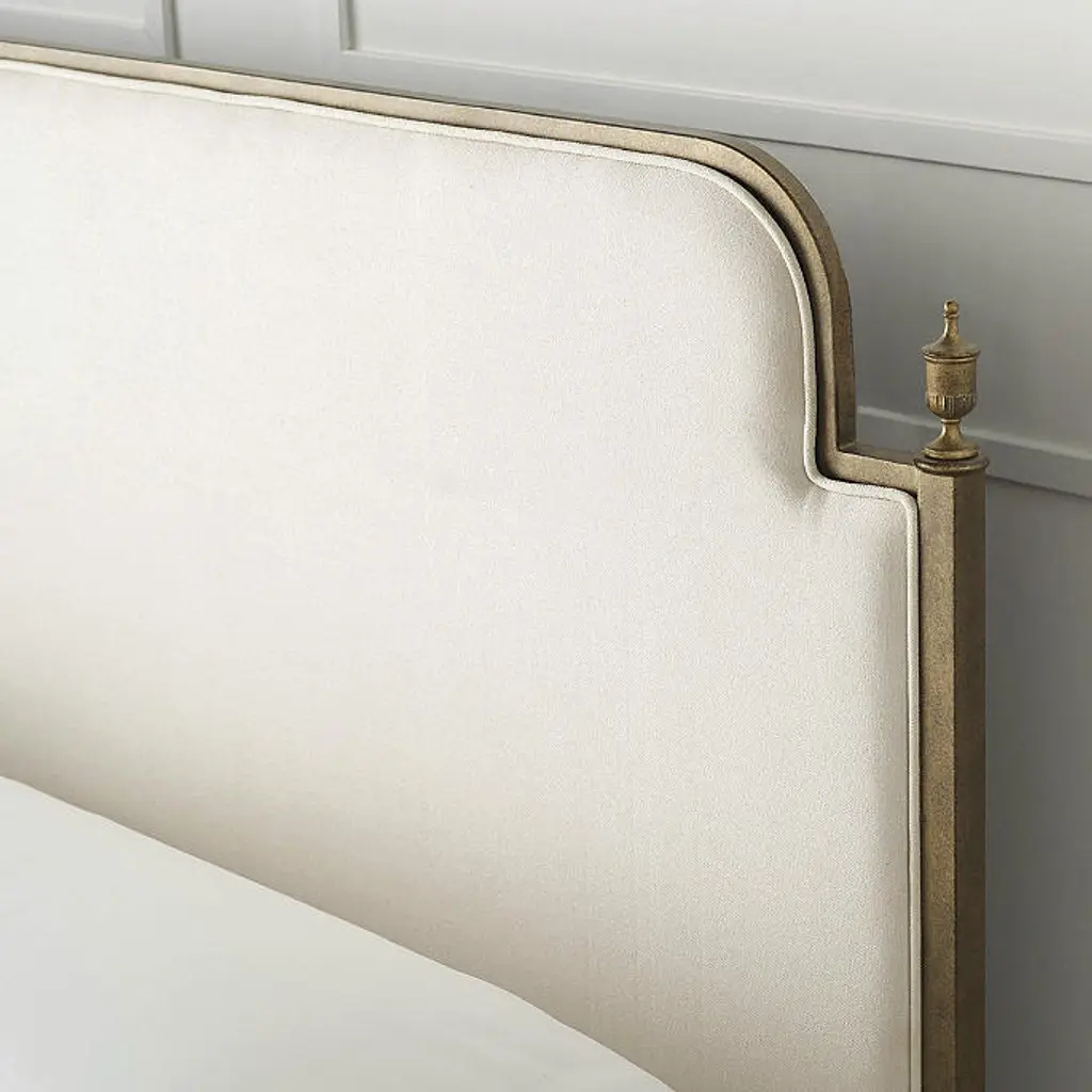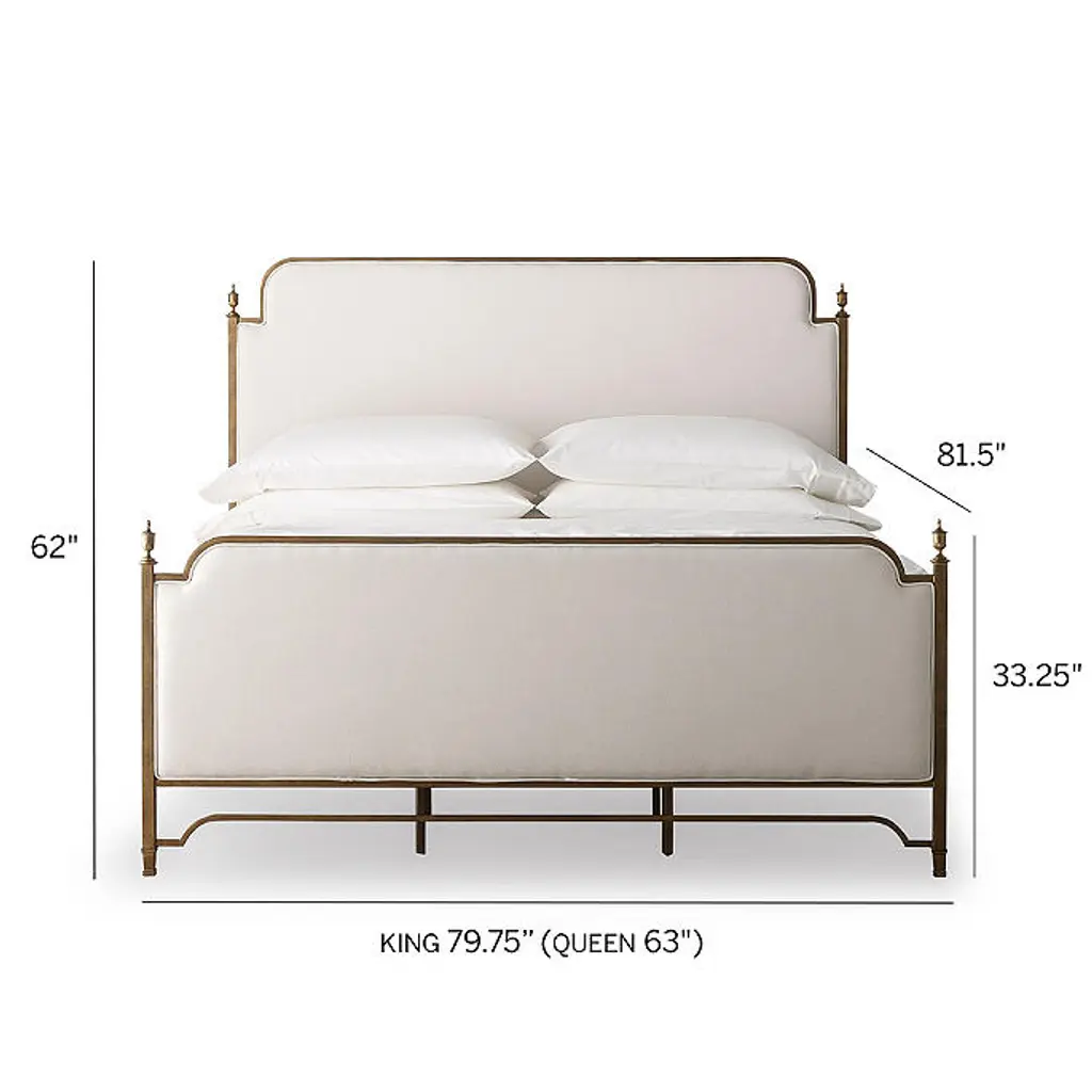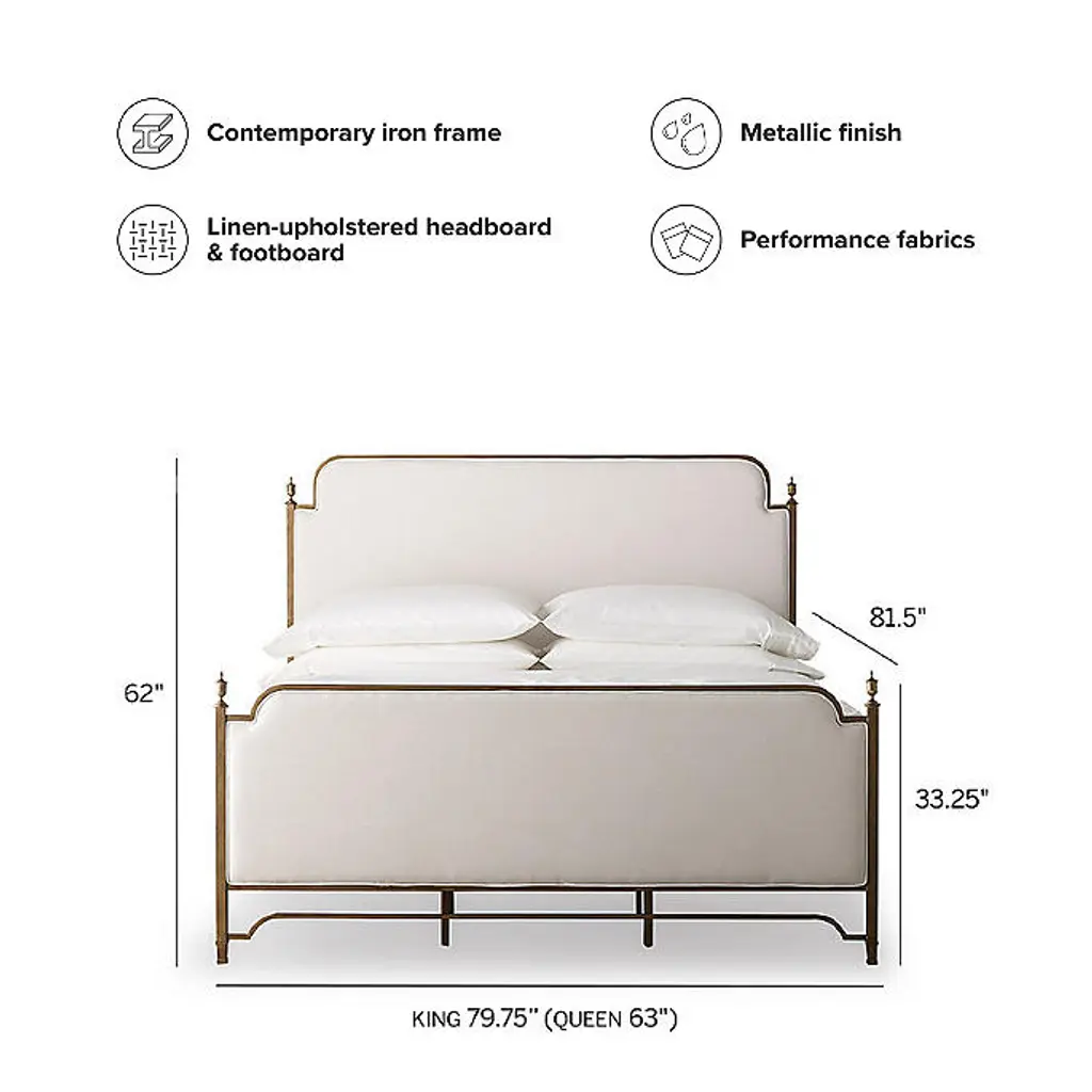 The Whitby Bed's clean design, classic finials and a contemporary iron frame create a bed with timeless style that pairs with any decor. Arched lines in the headboard, footboard and stretchers frame the bed, while the linen-upholstered headboard and footboard provide soft, soothing accents. Iron frame with a antiqued textured brass finish Headboard and footboard upholstered in linen with high-density foam fill Four metal support slats To prevent injuries or damage to item, recommended team lift (two or more people) for furniture placement Designed to be used with a mattress and box spring Assembly Required Twin Assembly Queen Assembly King Assembly Imported A Frontgate exclusive. At Frontgate, our primary focus is quality. We guarantee that every product we sell will stand up to the supreme test – our customers' satisfaction. To learn more about our policies, visit our Shipping & Processing, Returns & Exchanges and Warranty & Price Guarantee pages.