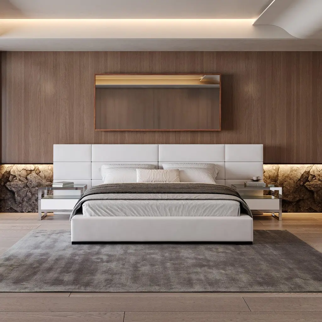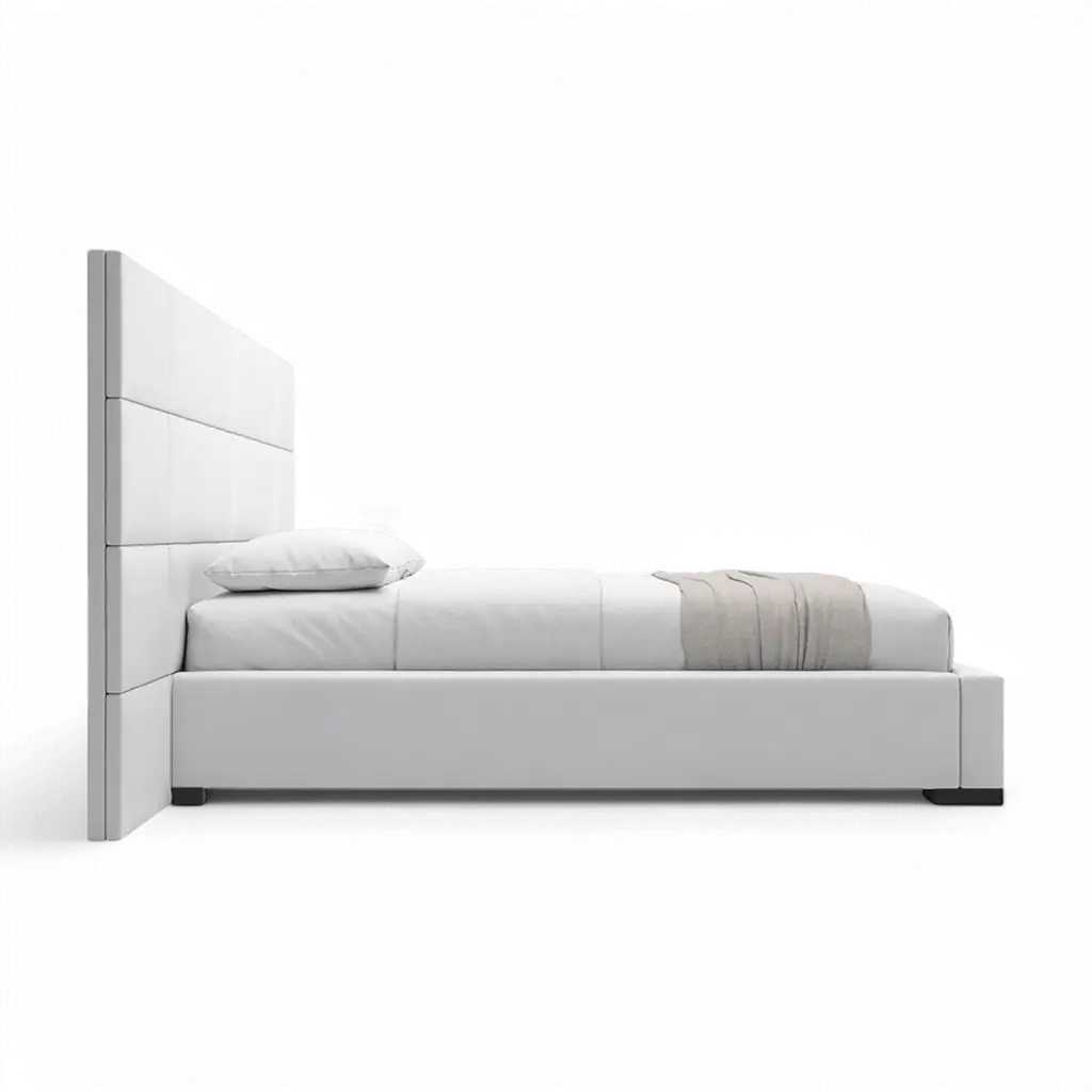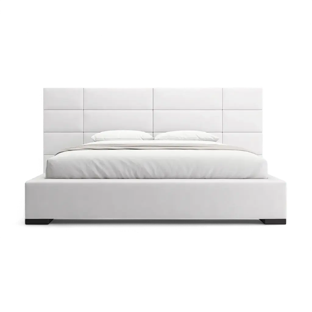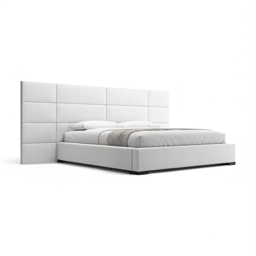The grandeur of the oversized headboard on the William Bed in White will turn any space into a room fit for royalty. The sharp, clean lines and tufted, square panels add charisma and personality, while the padded cushioning lends support. The expansive frame has been covered in gray leatherette and is secured with exquisite stitching. Give your bedroom the contemporary upgrade it needs!