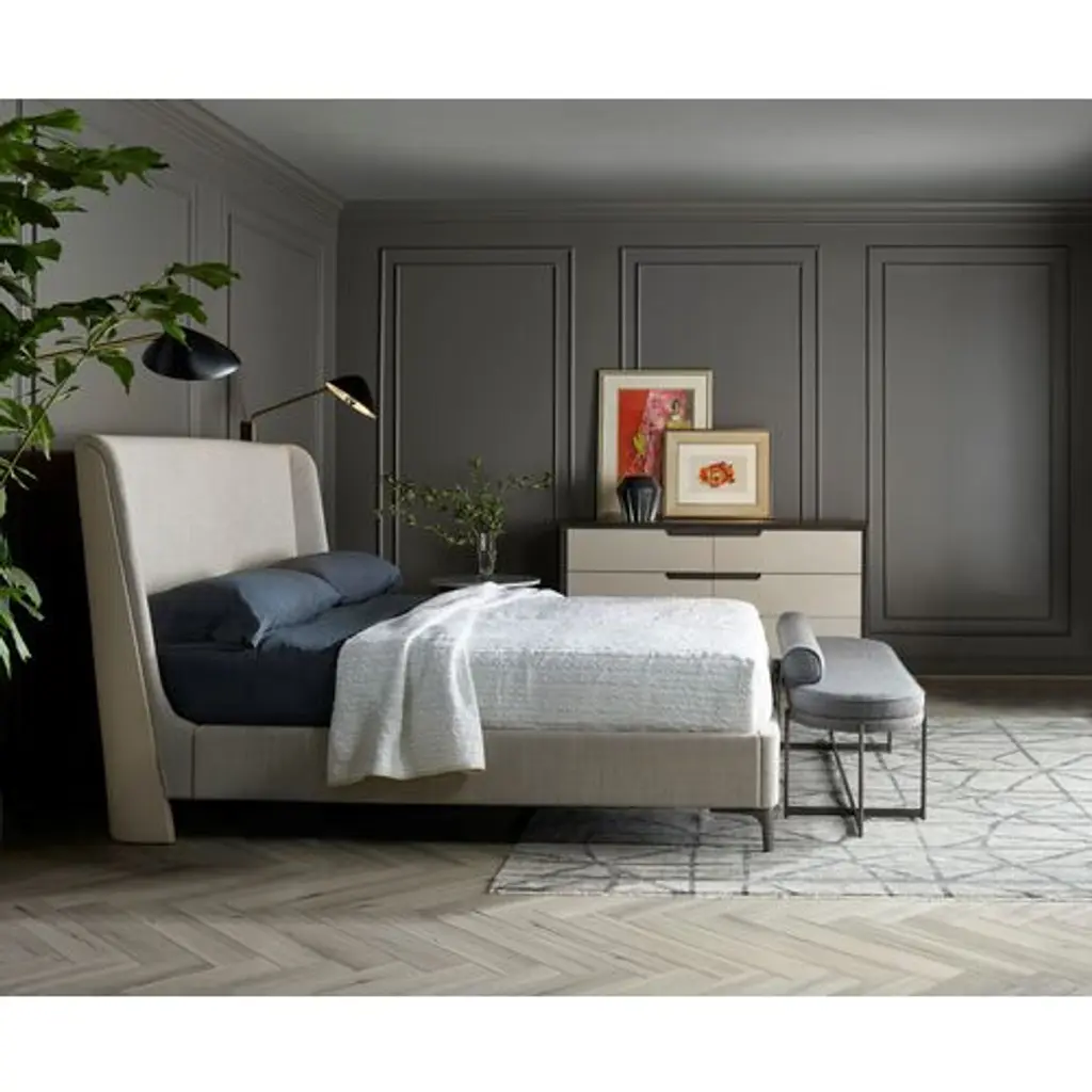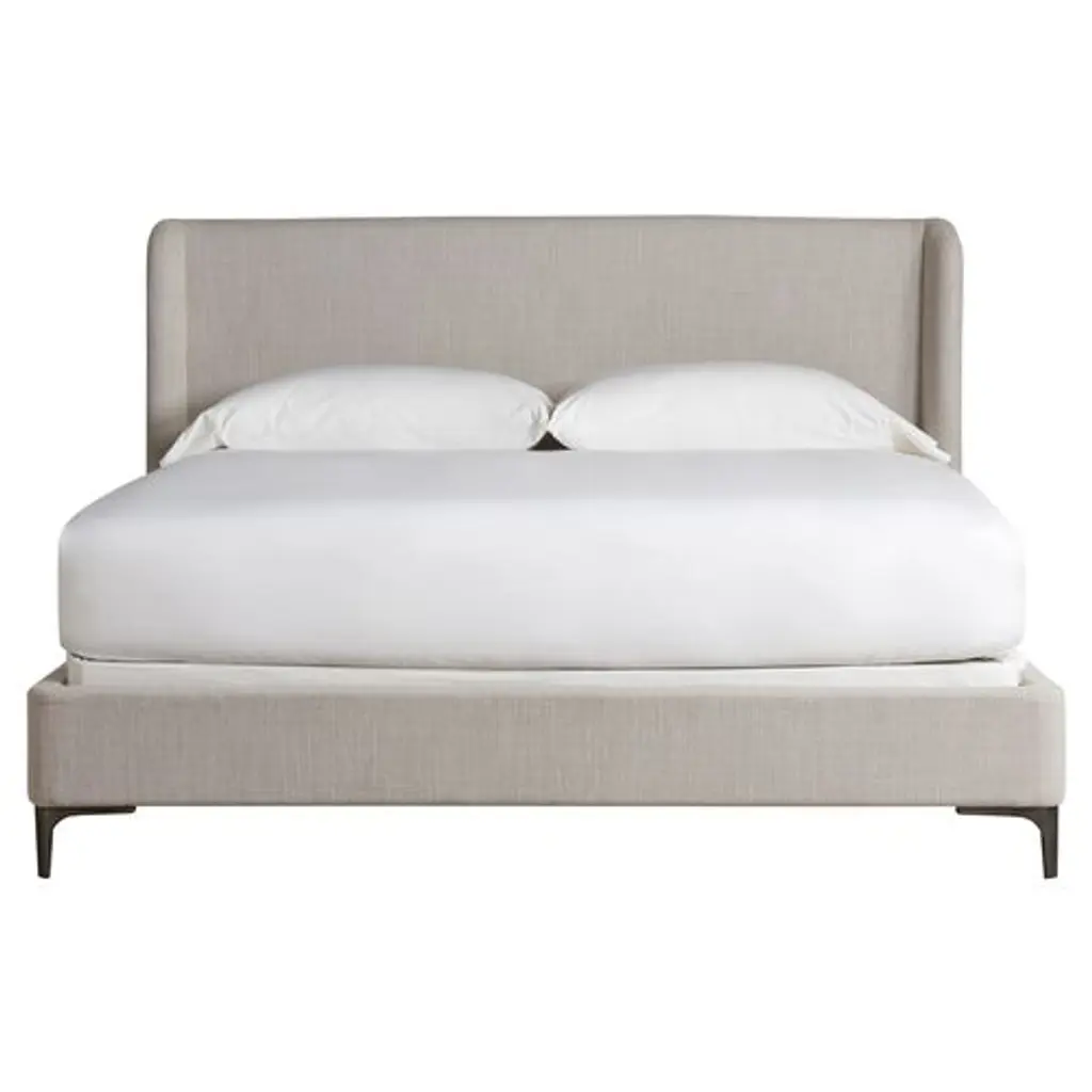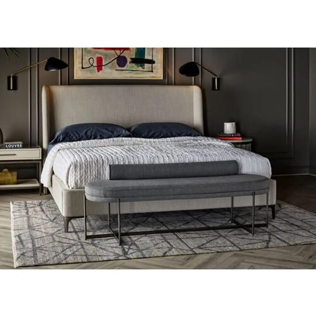 The exterior of this bed's headboard is clad in faux leather that provides a sleek, subtle complement to the linen-like upholstery covering the rest of the bed. The slender metal legs at the foot of the bed provide additional textural and tonal contrast. Bed requires box spring and mattress, not included.