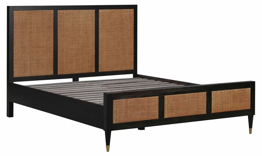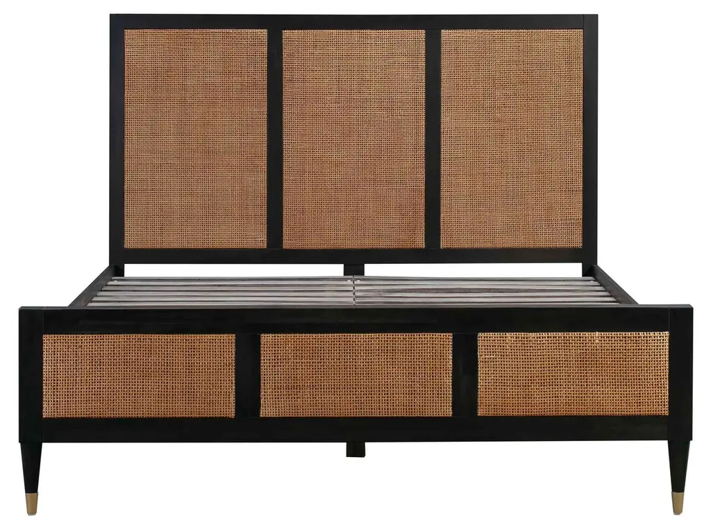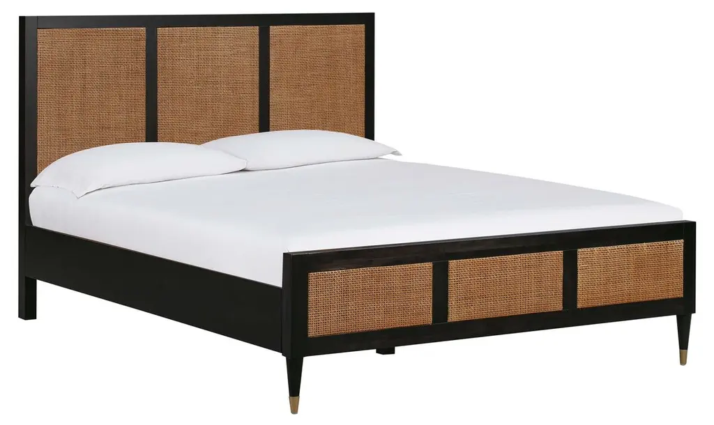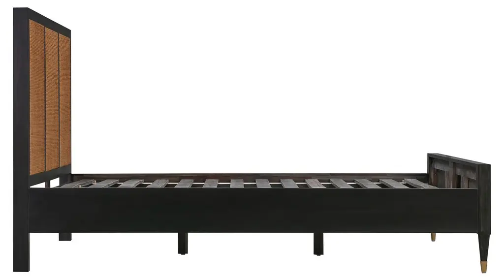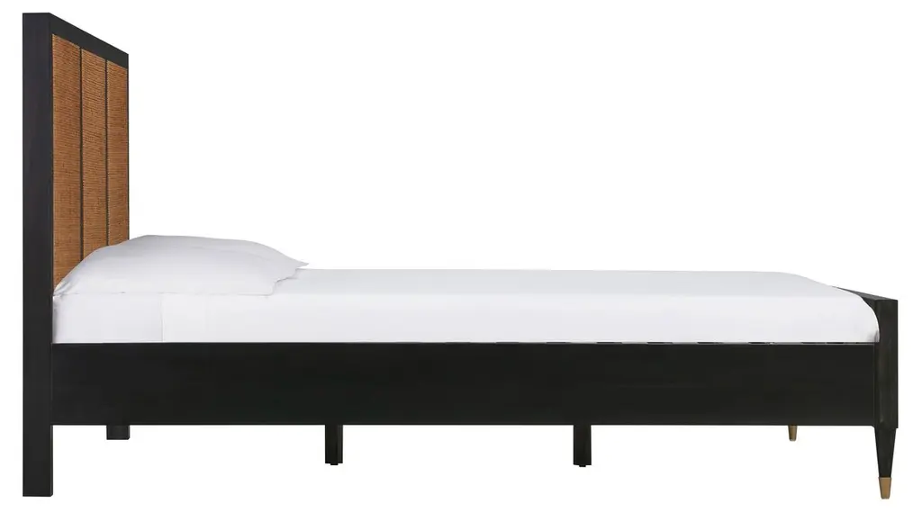 The silhouette is classically simply, but this handcrafted bed nonetheless makes a major style statement. That's thanks to the juxtaposition of the black wood frame and the rattan panels. The brass caps on the front tapered legs add subtle glimmer. Slats are included, and a box spring is not required.