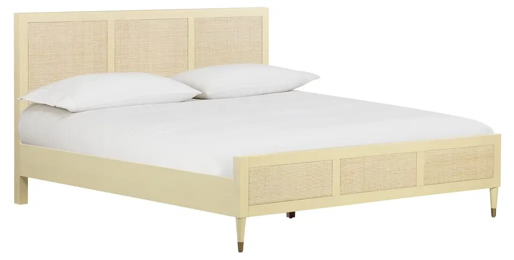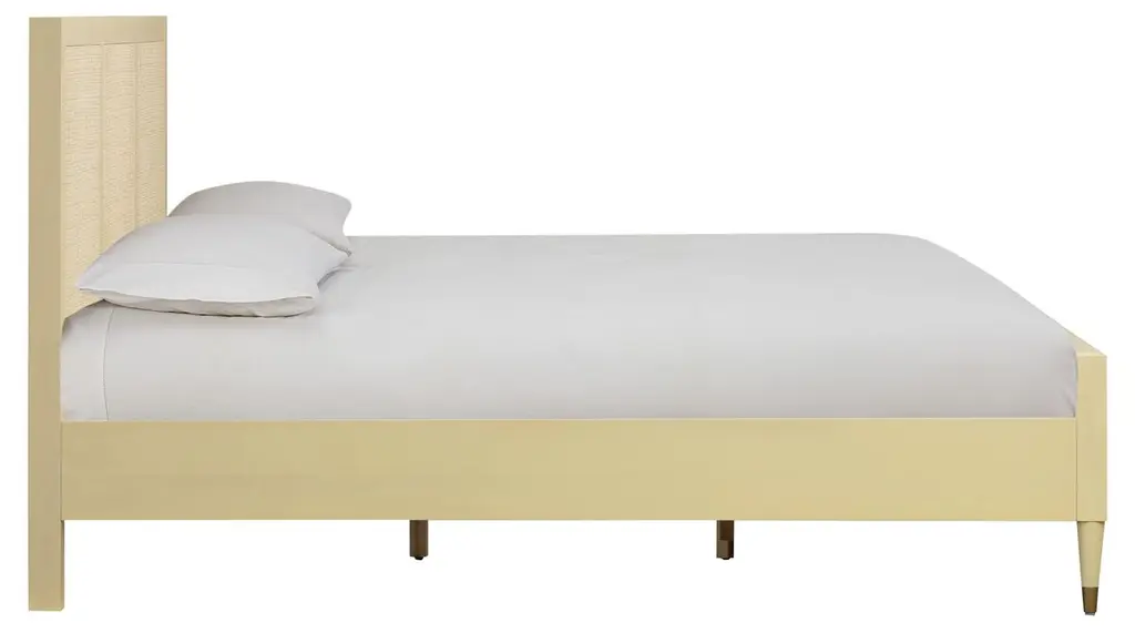 The silhouette is classically simply, but this handcrafted bed nonetheless makes a major style statement. That's thanks to the juxtaposition of the wood frame and the rattan panels. The brass caps on the front tapered legs add subtle glimmer. Slats are included, and a box spring is not required.