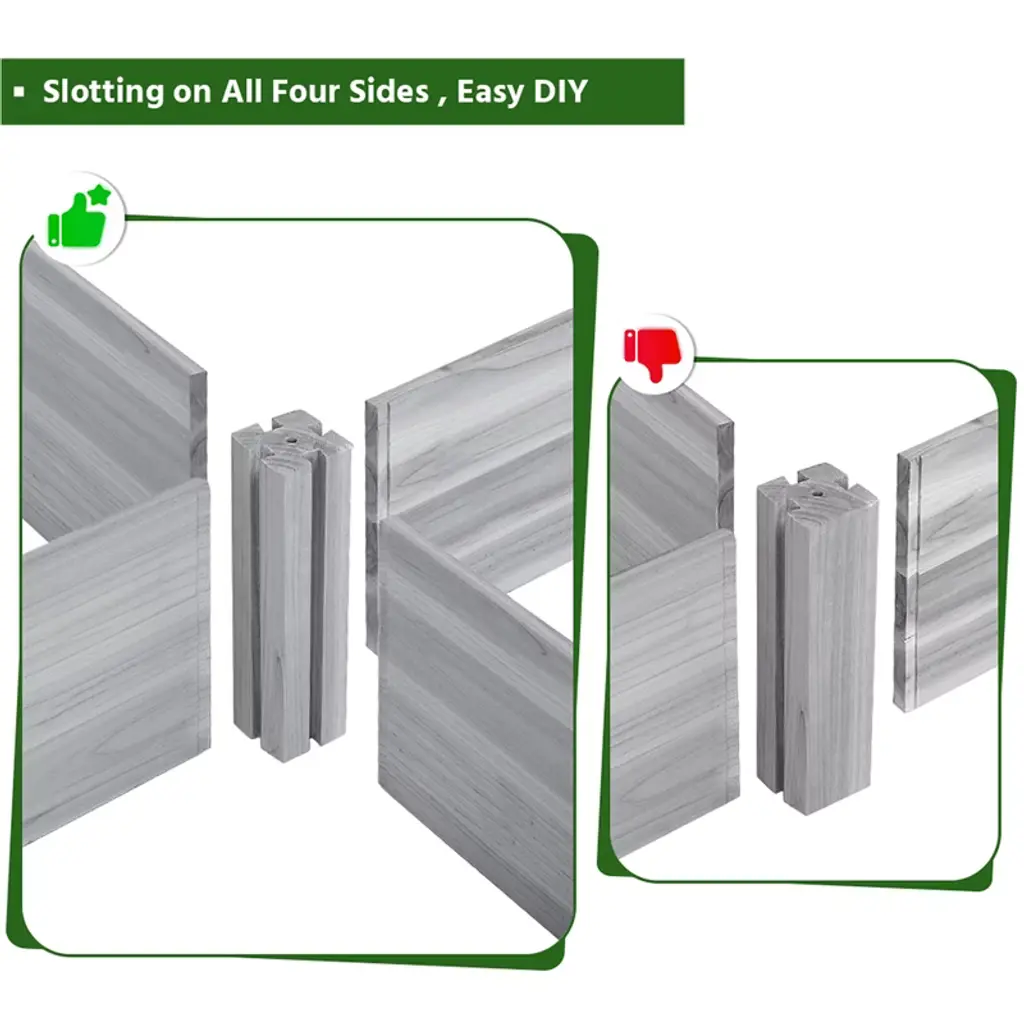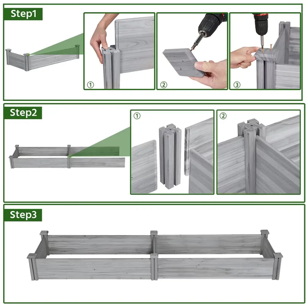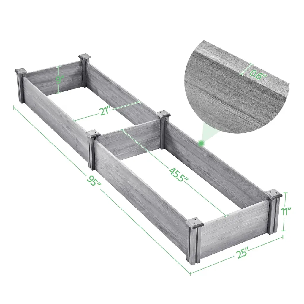 Plan to build a dream garden in your backyard? Let this raised the garden bed help you achieve that dream! With this high-quality garden bed planter, you can grow two different plants or try different planting methods at the same time. Each board is connected together with tetrahedral interlocking joints to keep the whole frame is tight and stable. This raised bed is made of selected natural wood, and we elaborately sand the bed to make it smooth and without wood splinters. This planter box will be your best choice for plants growing!* Specifications: Material: Solid WoodColor: Wood, Dark Brown, GrayDimension: 96.7 x 24.6 x 10.6inch (L x W x H)Inner Size: 46.3 x 21.1" x 9.1" ( L x W x H)Wood Board Thickness: 0.6"Please see the image for exact measurements.Do not step on the boards.