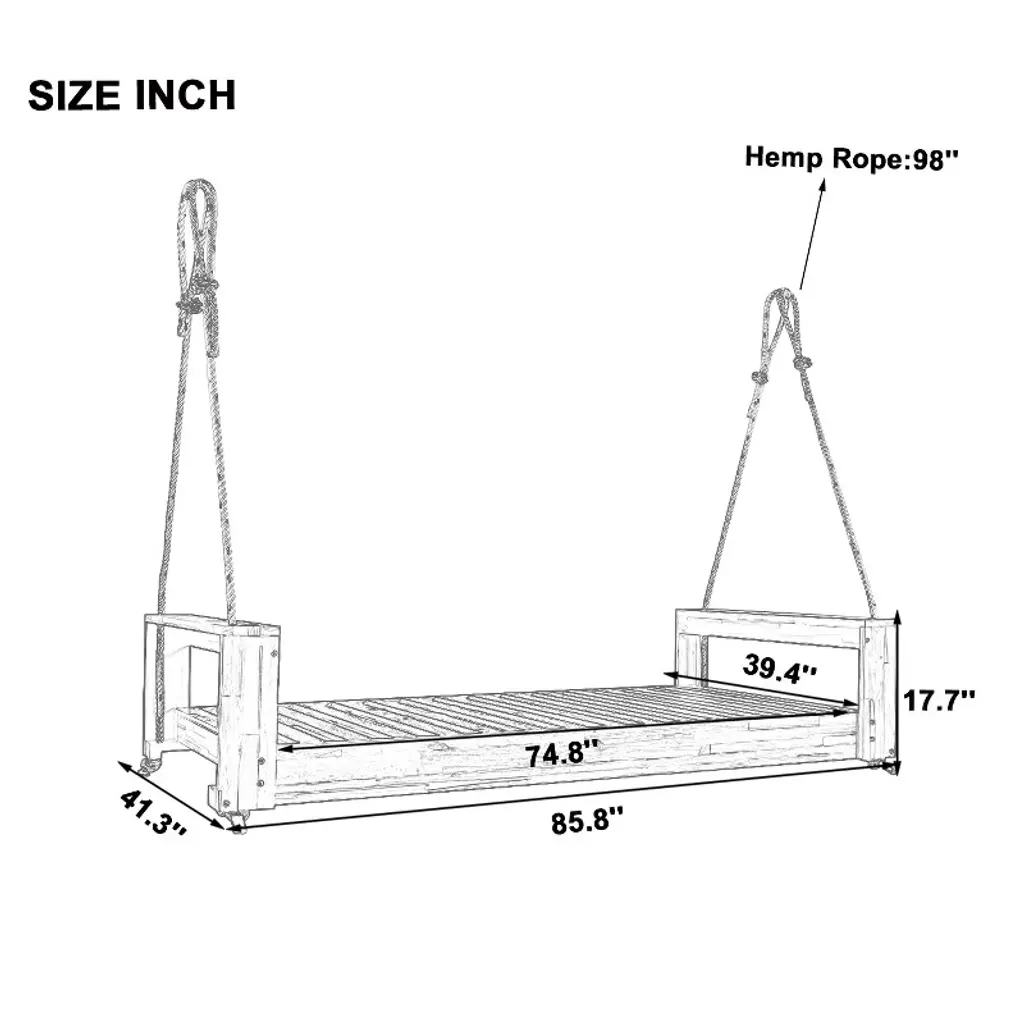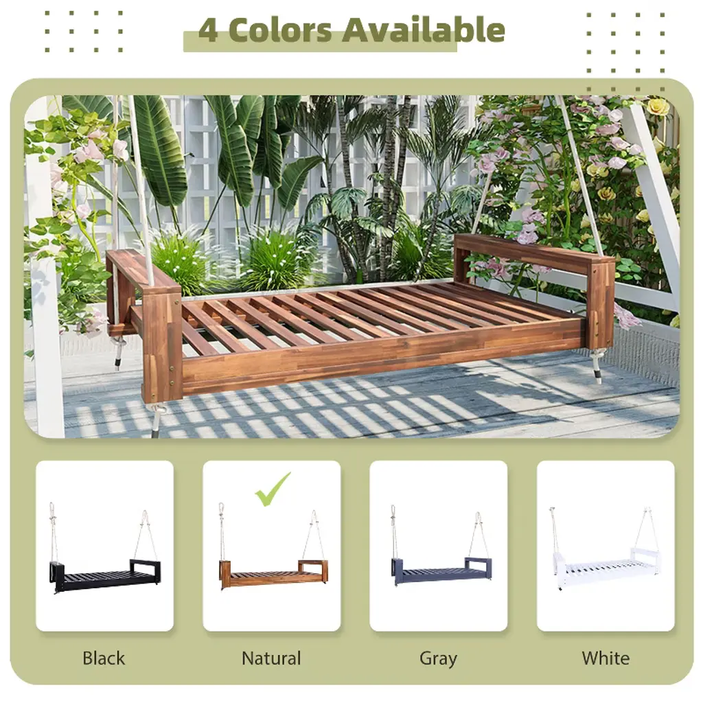 Elevate your outdoor living with this stylish and durable Acacia Wood Porch Swing Bed.Combining rustic charm with modern functionality, this swing bed is designed for relaxation.Crafted from weather-resistant acacia wood and supported by sturdy hemp ropes, it offers a secure and comfortable lounging experience. Perfect for gardens, patios, or porches, this swing bed adds a touch of enjoyment to any outdoor space while providing ample room for a twin-size mattress.