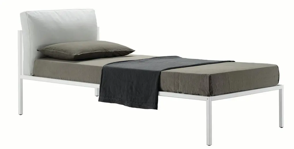 "Zanotta Queen Size Nyx Bed in White Fabric with White Painted Steel Frame by Emaf ProgettiDemountable steel frame painted in the shade of black or white. Suspension in natural bent beech strips, with stiffness adjusters; they are mounted on roll-up nylon chains. The bed has headboard cushions with goose down – 100% pure material, with polyurethane insert. Removable external fabric or leather cover. The sizes written in brackets are those of the mattress. Upon request the bed size for 82 11/16” long mattress is also available with a price surcharge of 14%.Additional Information:Material: Steel, fabricUpholstery finish: White, Teatro, cat. 30, 26901Frame finish: WhiteDimension: 166 W x 218 D x 94 H cmSeat height: 35 cmAvailable in other upholstery options: Cat. 20, Cat. 40, Leather 90, Leather 95, Leather 98, Leather 99Available in other frame finish option: BlackAvailable in other size options: Small, medium, extra large, kingAvailable in other structural options"