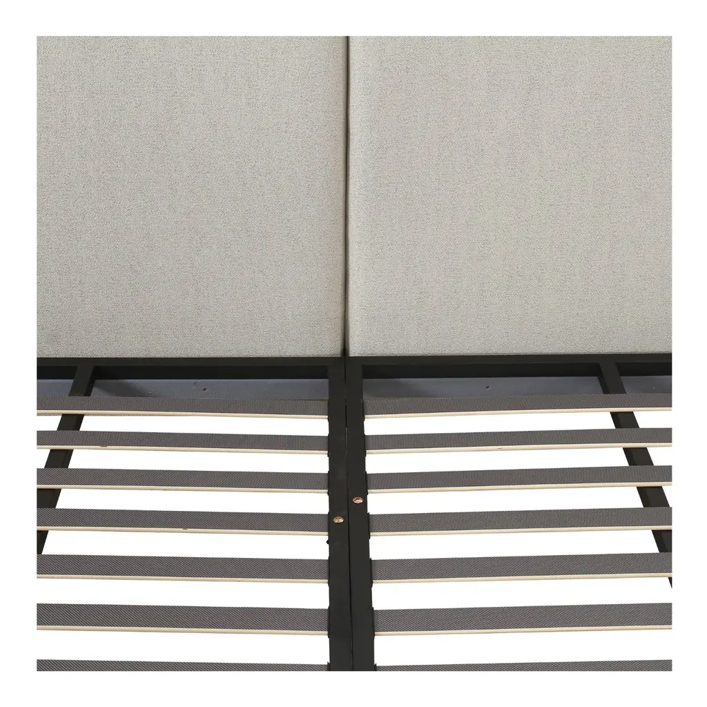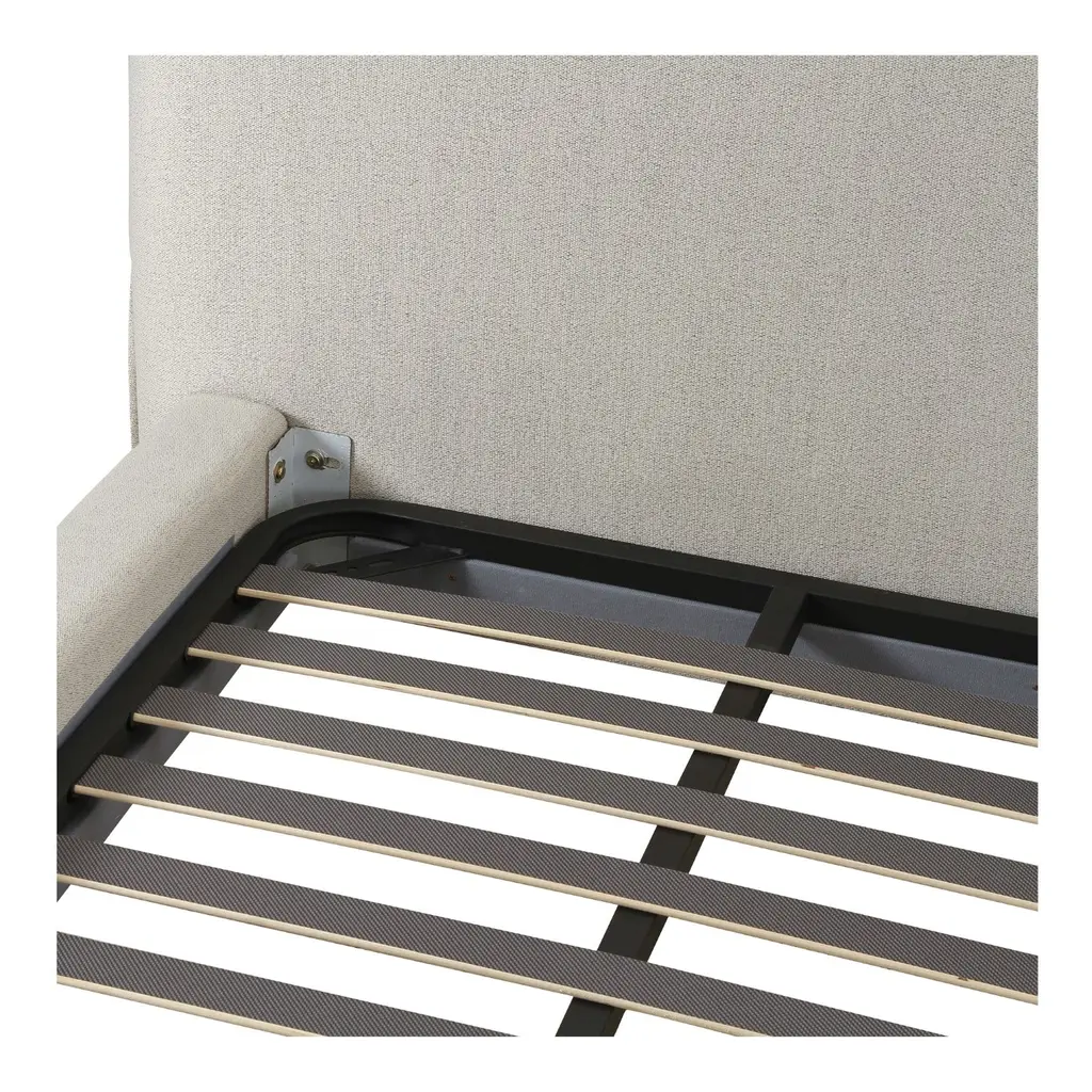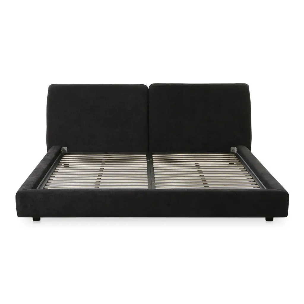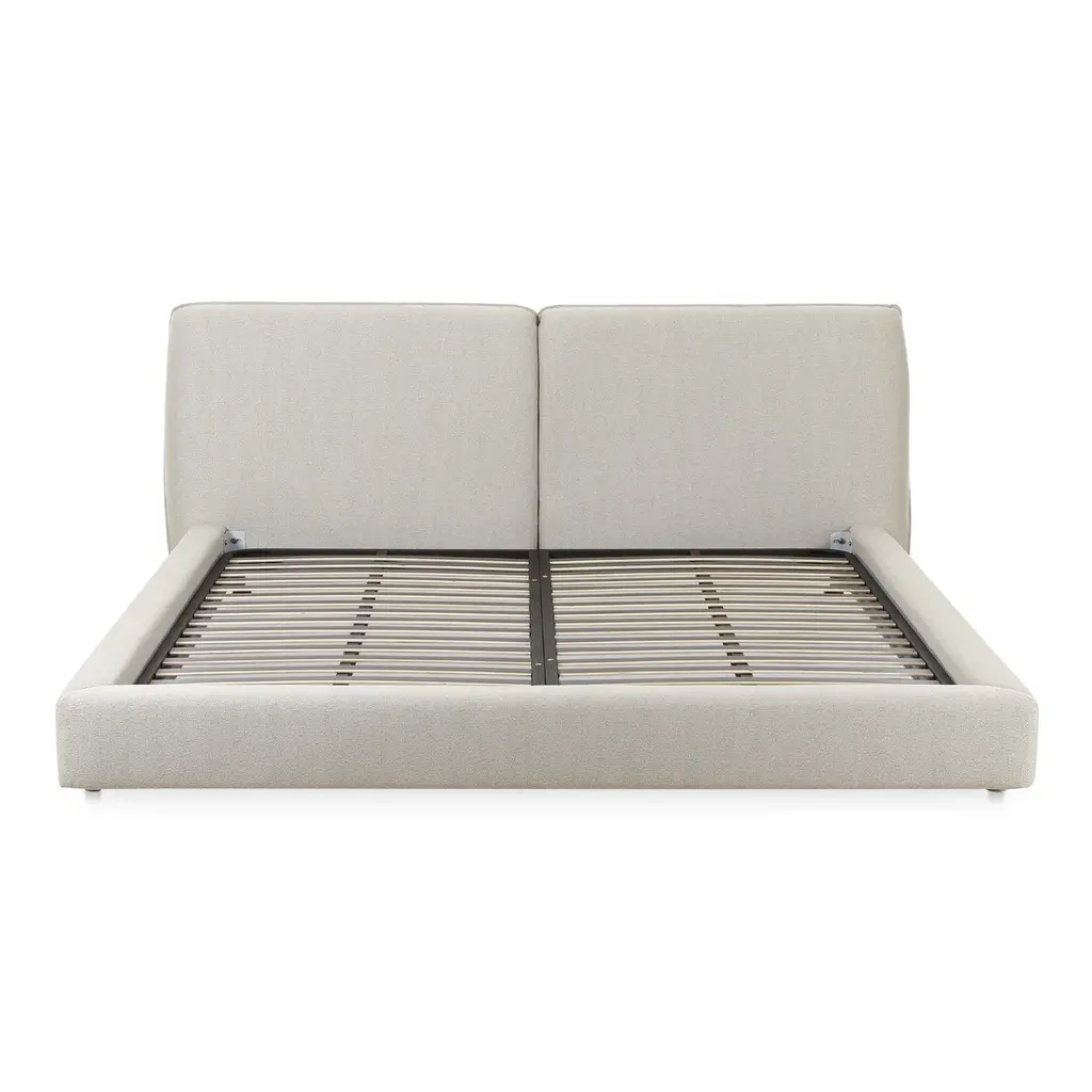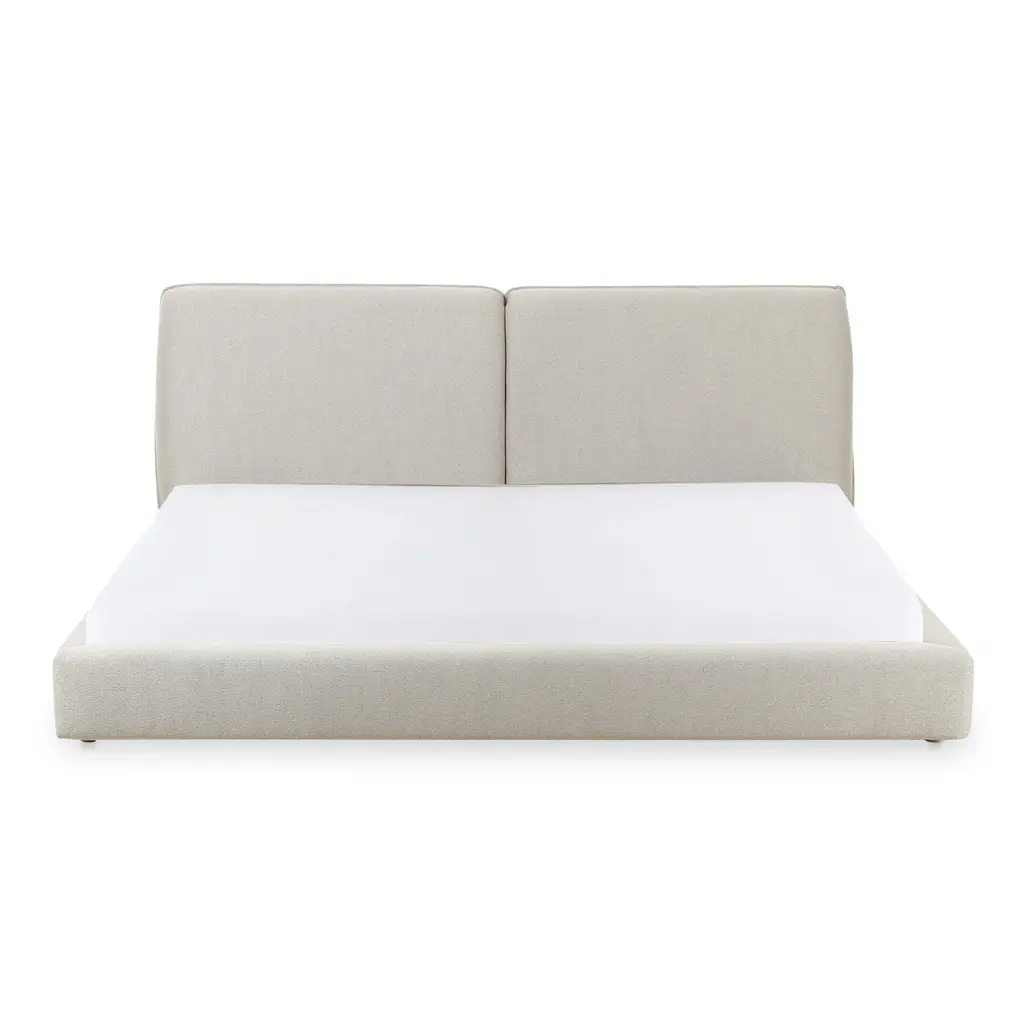 Featuring a low-slung, 70's inspired silhouette, the Zeppelin bed's comfort-driven intention features gentle curves and a subtle floating base design that lends to a sense of weightlessness. Its linen-blend upholstery provides a refined texture, while the plump foam cushion headboard speaks to its softness and appeal.