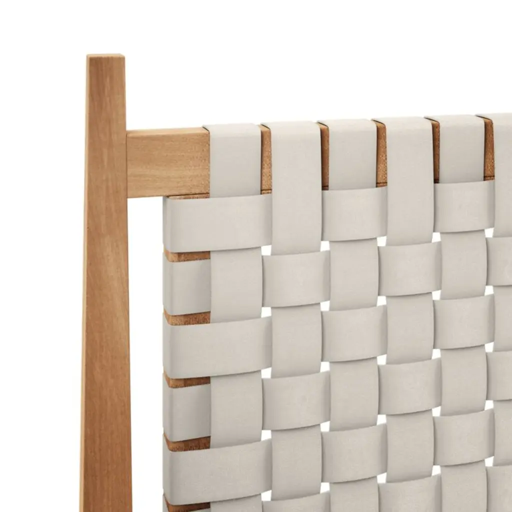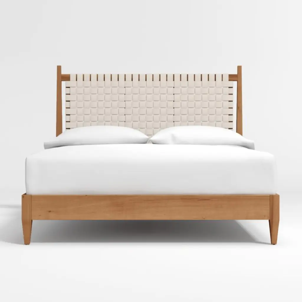 White leather weaves a striking headboard that evokes a classic design of Scandinavian modern furniture. Solid sungkai wood with maple veneer shapes the bed's streamlined frame, hinting at tradition with square tapered legs and the handwoven grid wrapped around the subtly posted headboard. The Rio bed is a design you'll only find at Crate and Barrel.