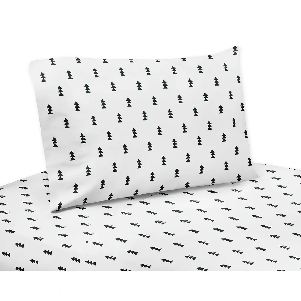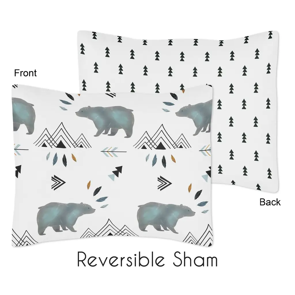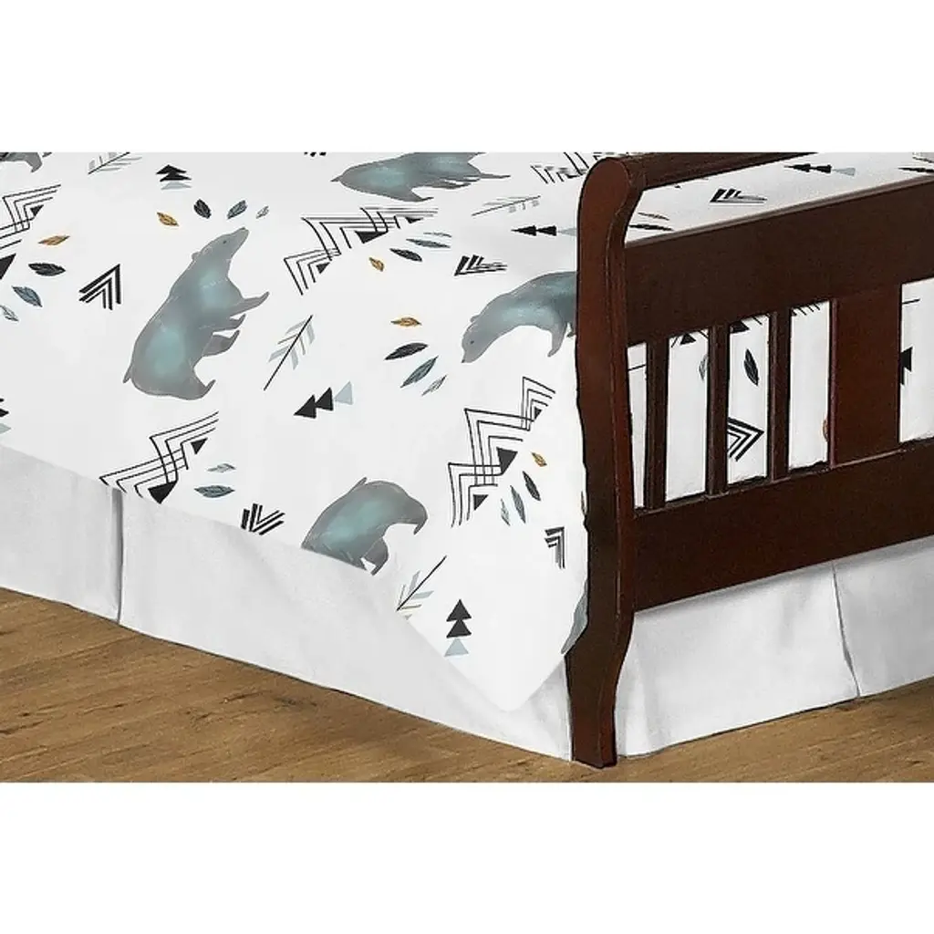 Create a cozy look in your toddler's bedroom with this fun five-piece set of Bear Mountain bedding by Sweet Jojo Designs. Cool blues, black, and white create a designer look while soft, machine-washable microfiber makes this set feel inviting and comforting. A pillowcase, sham, fitted and flat sheets, and a comforter provide all you need to transform your toddler's bed.