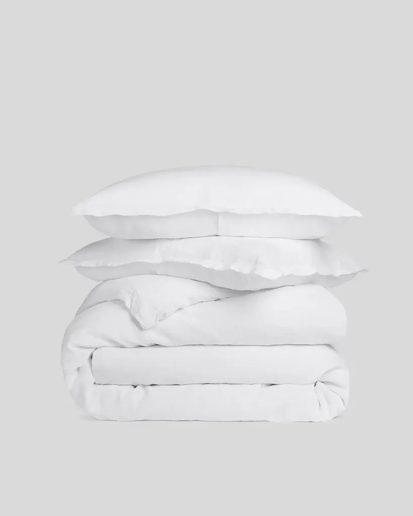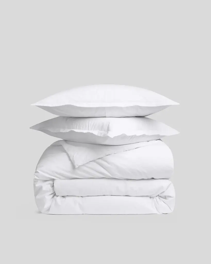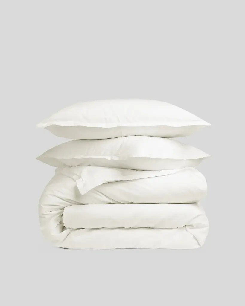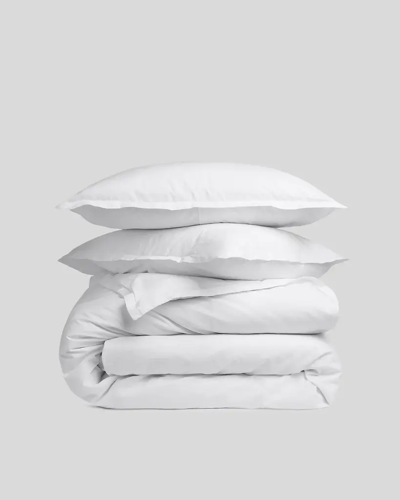 Dreamy down-filled duvet and pillows sleep all-season comfort. Encased in cambric cotton and double-stitched with cotton cording, bedding set is intricately constructed with featherlight down that stays in place snooze after snooze. Set includes a full/queen duvet insert and two standard pillow inserts. CB2 exclusive.