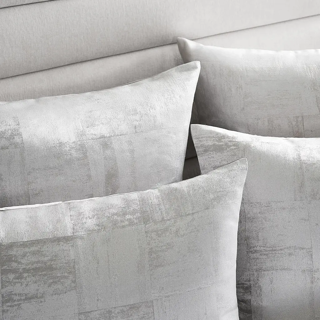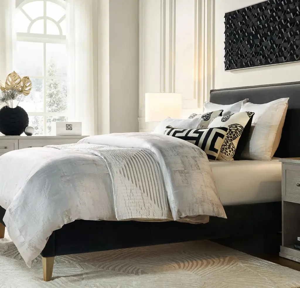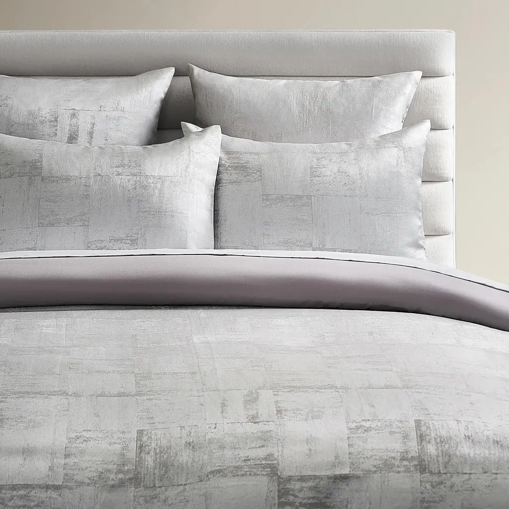 Elevate your space with the Auden Bedding Collection, a refined blend of modern luxury and sophistication. Crafted in platinum jacquard with a subtle, directional block pattern, this collection creates a sleek, elegant aesthetic. The knife-edge detail and button closure add polished touches to the duvet, while envelope closure shams complete the tailored look. Each set includes a duvet cover and two shams, with coordinating Euro shams sold separately. Let Auden bring a touch of understated glamour to your bedroom.Z Gallerie exclusive