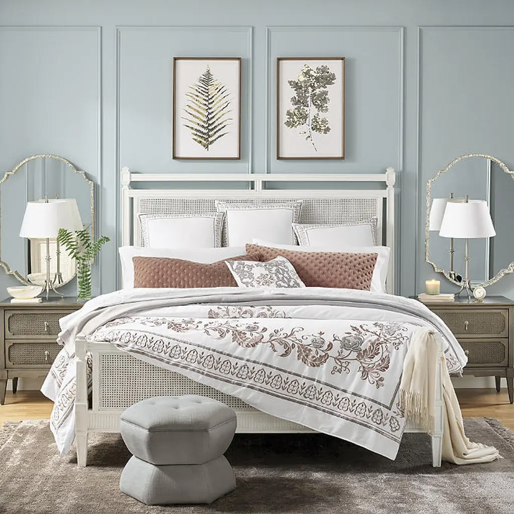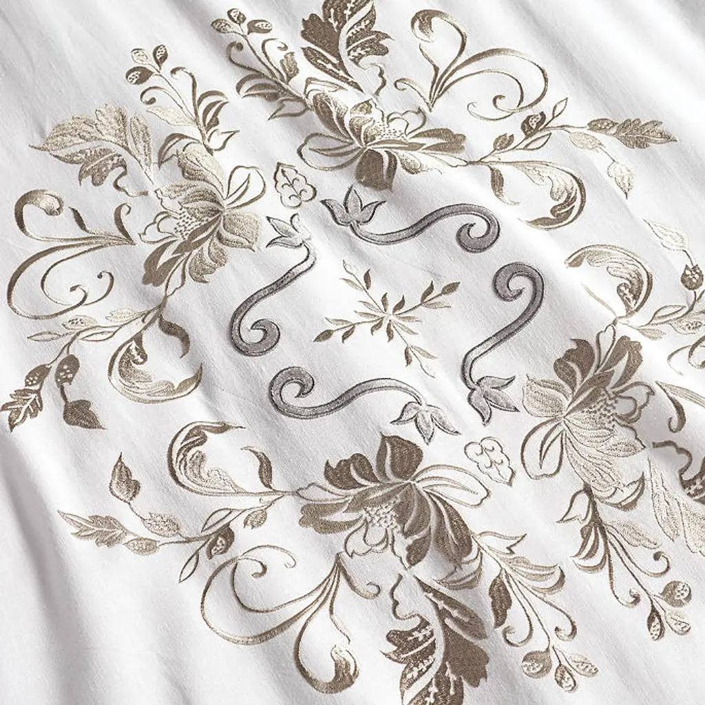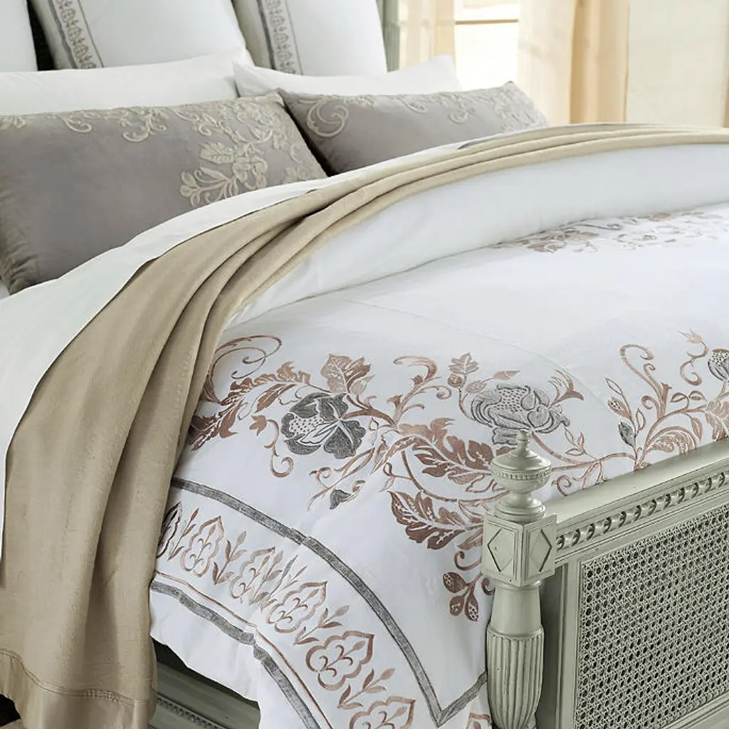 A serene retreat with embellishments done by hand. Scrolling vines and pomegranates, in soft shades of blush and gray, are embroidered on a cotton/linen blend and accented with velvet applique. The Euro Sham is hand-embroidered with a stylized border leaf design in shades of blush and gray. This delicate detail is accented with velvet applique. On the Standard and King shams, gray velvet is adorned with creme-colored embroidery. Blush duvet cover and shams are 90% cotton, 10% linen Gray shams are 60% viscose, 40% cotton velvet Corner ties keep duvet firmly in place Duvet has hidden button closure Shams have zipper closure Shams sold individually Dry clean Imported A Frontgate exclusive. At Frontgate, our primary focus is quality. We guarantee that every product we sell will stand up to the supreme test – our customers' satisfaction. To learn more about our policies, visit our Shipping & Processing, Returns & Exchanges and Warranty & Price Guarantee pages.