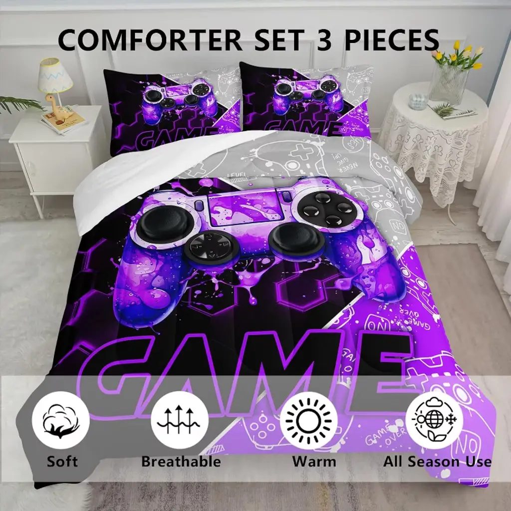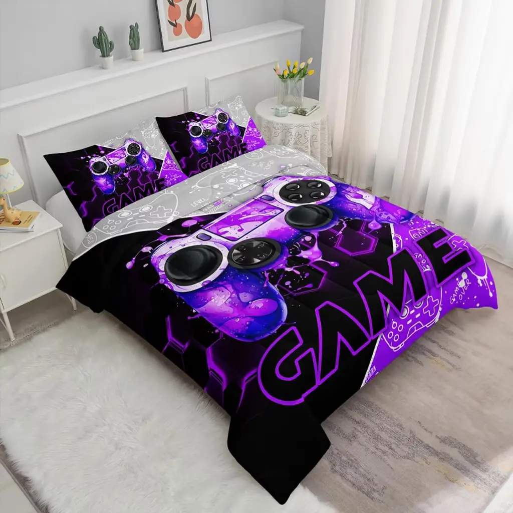 This boy-exclusive 3D gaming controller geometric bedding three-piece set features a modern purple graffiti style as its design core, seamlessly blending the dynamic energy of gaming with the unique personality of art. The three-dimensional, lifelike 3D game controller patterns seem to leap off the bedding, instantly igniting a boy's passion for gaming. The interplay of geometric lines and purple graffiti not only showcases a trendy, individualistic style but also conveys vibrant youthful energy, transforming the bedroom into a cool, ¡°gaming hub.¡± The fabric is made from skin-friendly, breathable materials, offering a soft and comfortable touch, ensuring boys can sleep soundly in a comfortable environment. Whether decorating a children's room or fulfilling teenagers' pursuit of a personalized sleeping space, this bedding set stands out as a stylish focal point in the bedroom, adding a touch of trendy flair to boys' lives.